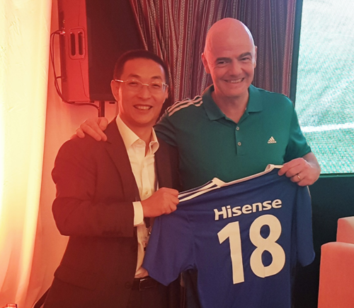 ????2017年5月10日,借巴林國際足聯(lián)大會,國際足聯(lián)主席詹尼?因凡蒂諾接見海信特別代表、海信迪拜分公司總經(jīng)理孫家印并表示:特別希望海信發(fā)揮顯示技術(shù)的優(yōu)勢,讓2018年俄羅斯世界杯的觀眾觀看體驗再上一級。