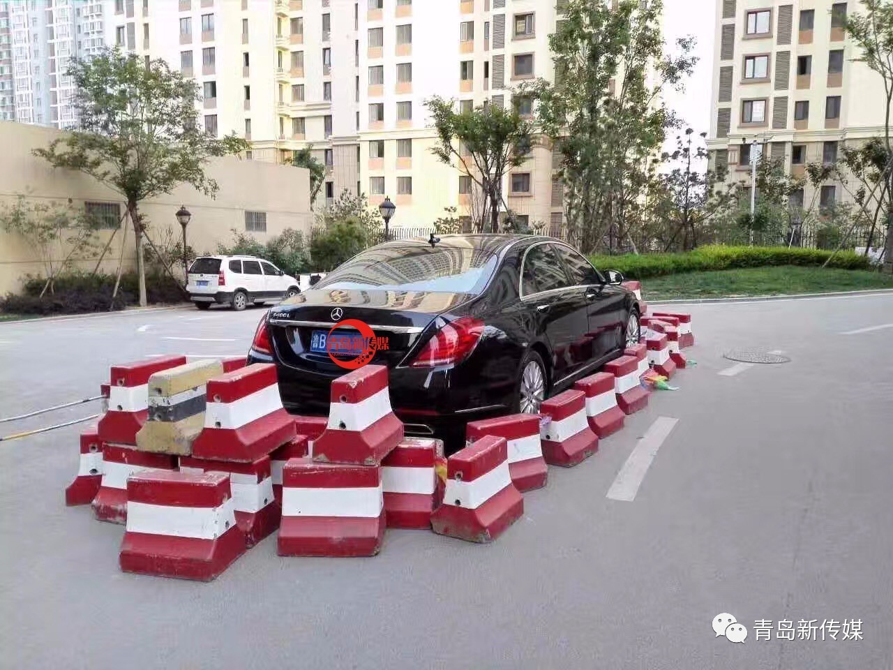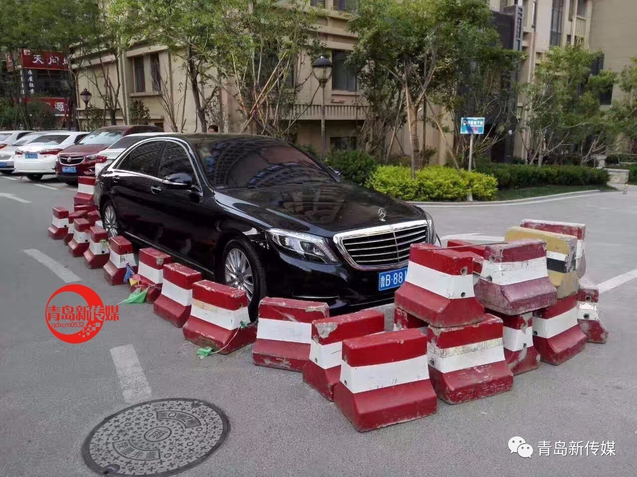 青島某小區(qū)內(nèi),一奔馳車(chē)亂停放在小區(qū)路中間,第二天起來(lái)一看,被石墩包圍了……