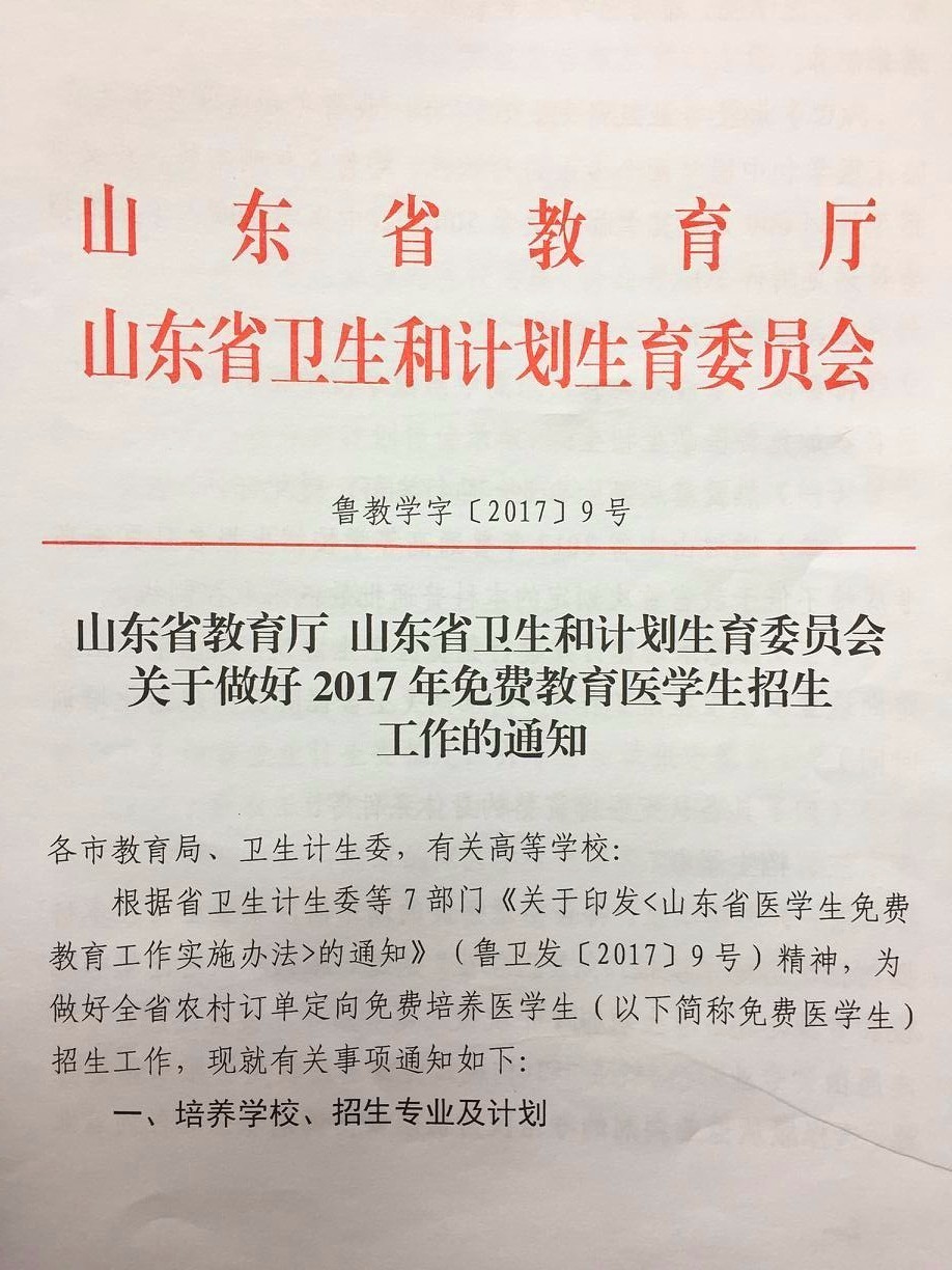 根據(jù)省衛(wèi)生計(jì)生委等7部門(mén)《關(guān)于印發(fā)<山東省醫(yī)學(xué)生免費(fèi)教育工作實(shí)施辦法>的通知》(魯衛(wèi)發(fā)〔2017〕9號(hào))精神,為做好全省農(nóng)村訂單定向免費(fèi)培養(yǎng)醫(yī)學(xué)生(以下簡(jiǎn)稱(chēng)免費(fèi)醫(yī)學(xué)生)招生工作,現(xiàn)就有關(guān)事項(xiàng)通知如下: