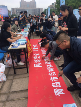 ????當天,青島市自媒體聯(lián)盟組織青島知名自媒體到場參與活動。青島特色、青島今日、微視青島、薄閑陽、圖說視界、青島優(yōu)生活等成員單位認真學(xué)習(xí)了《網(wǎng)絡(luò)安全法》相關(guān)知識,在“網(wǎng)絡(luò)安全 衛(wèi)國為家 青島市自媒體聯(lián)盟成員單位學(xué)習(xí)《網(wǎng)絡(luò)安全法》”橫幅上簽名。自媒體人紛紛表示,一定要學(xué)法、守法、宣傳法,維護網(wǎng)絡(luò)安全,積極傳播正能量。