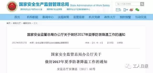 ????5月17日,安監(jiān)總局辦公廳發(fā)布了《關(guān)于做好2017年夏季防暑降溫工作的通知》,要求最大限度地減少勞動(dòng)者高溫中暑事件的發(fā)生。