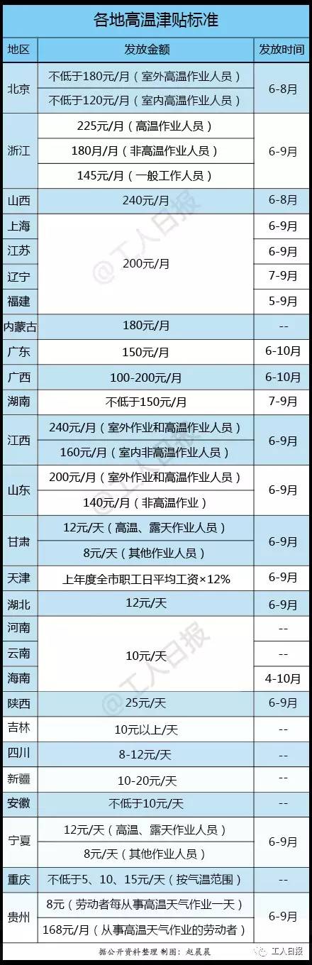 ????對于發(fā)放高溫津貼,各地標(biāo)準(zhǔn)不一,具體如下圖: