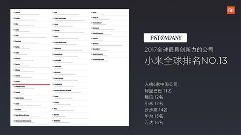 Company發(fā)布的創(chuàng)新力榜單中,小米公司在2017全球最具創(chuàng)新力公司中排名第13位。
