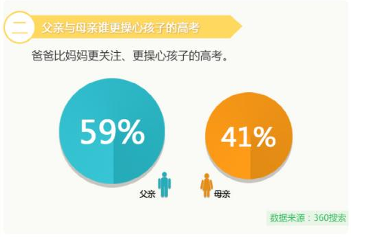 ????有趣的是,盡管父母對(duì)孩子高考同樣關(guān)注,但如果真的深究起“父親和母親到底誰(shuí)更操心孩子高考”,恐怕大部分人會(huì)慣性地認(rèn)為母親更加關(guān)注孩子的學(xué)習(xí)與生活。然而大數(shù)據(jù)卻給出了相反的答案,父親在孩子高考過(guò)程中的關(guān)注度以59%的明顯優(yōu)勢(shì)勝出,看來(lái)學(xué)習(xí)這件事,還是要學(xué)霸老爹親自監(jiān)督。
