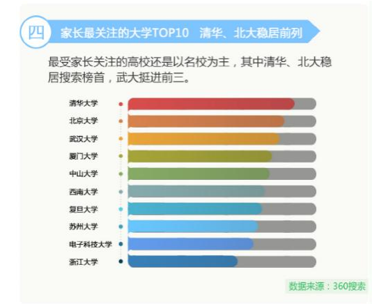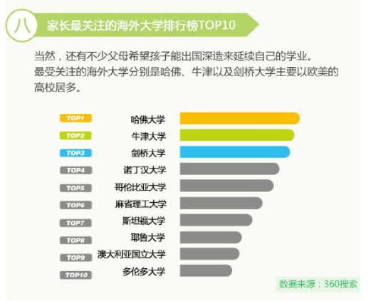 ????從高中考入大學(xué),意味著很多人要離開(kāi)自己從小長(zhǎng)大的故鄉(xiāng)去另外一個(gè)城市甚至國(guó)家求學(xué),在這件事上,家長(zhǎng)們自然也早有打算。360搜索數(shù)據(jù)顯示,在高考家長(zhǎng)更希望孩子去的國(guó)內(nèi)城市中,北京作為首都毫無(wú)懸念位列榜首,江蘇、上海、湖北、四川也榜上有名。而也有很多父母直接選擇將孩子送往海外留學(xué),其中哈佛、牛津、劍橋成為最受關(guān)注的三所國(guó)外大學(xué),其余上榜大學(xué)也均以歐美或發(fā)達(dá)國(guó)家組成,可見(jiàn)異鄉(xiāng)求學(xué)的過(guò)程中,除了學(xué)校本身,家長(zhǎng)與學(xué)生更加看重所在城市的發(fā)達(dá)程度能否幫助孩子拓展視野和見(jiàn)識(shí)。