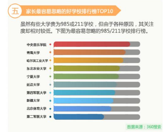 ????家長(zhǎng)關(guān)注名校是普遍現(xiàn)象,然而由于信息獲取渠道有限,有很多高校貴為985、211學(xué)校,關(guān)注度卻不溫不火。報(bào)告中就針對(duì)這一現(xiàn)象,列舉了最易被家長(zhǎng)忽略的好學(xué)校TOP10,其中中央音樂(lè)學(xué)院、青海大學(xué)、哈爾濱工業(yè)大學(xué)位列三甲,家長(zhǎng)和孩子不妨將目光轉(zhuǎn)向這些競(jìng)爭(zhēng)不太激烈的好學(xué)校。