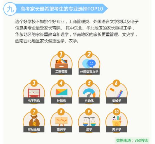 ????俗話說(shuō),男怕入錯(cuò)行。大學(xué)的好壞只是一方面,選擇一個(gè)好專業(yè)才是影響一個(gè)人未來(lái)發(fā)展的重要因素。在報(bào)告中,工商管理類與外語(yǔ)專業(yè)成為熱門,逐漸取代了曾經(jīng)大熱的計(jì)算機(jī)專業(yè)。而在地區(qū)的傾向性上,東北、華北地區(qū)的家長(zhǎng)更青睞工學(xué),華東地區(qū)的家長(zhǎng)看重理學(xué)與教育,華南地區(qū)家長(zhǎng)偏愛(ài)管理、文史學(xué),西南西北地區(qū)家長(zhǎng)偏重醫(yī)學(xué)、農(nóng)學(xué)。