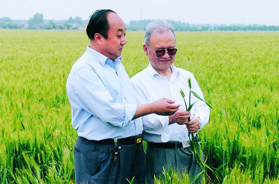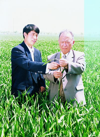 ????2006年5月,已經(jīng)85歲的余松烈(右)與棗莊市種子管理站站長、研究員孔德貴(左)在田間研究小麥發(fā)育情況