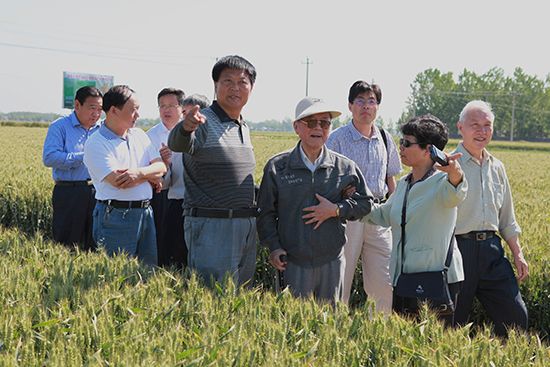 ????2011年6月1日,90歲高齡的余松烈(右四)堅(jiān)持到泰安市岱岳區(qū)馬莊鎮(zhèn)小麥高產(chǎn)攻關(guān)田考察