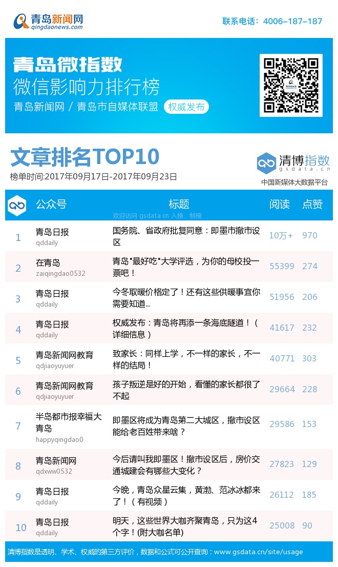 本周最熱的話題莫過于即墨撤市設區(qū)了。9月20日,青島官方正式發(fā)布即墨撤市設區(qū)的通告,各大微信也是使出了渾身解數(shù)搶發(fā)信息。其中“青島日報”于9月20日最早發(fā)出了“國務院、省政府批復同意:即墨市撤市設區(qū)”的推文,一時間刷爆青島人朋友圈,最終以閱讀10萬+,點贊970次高居媒體類榜首。