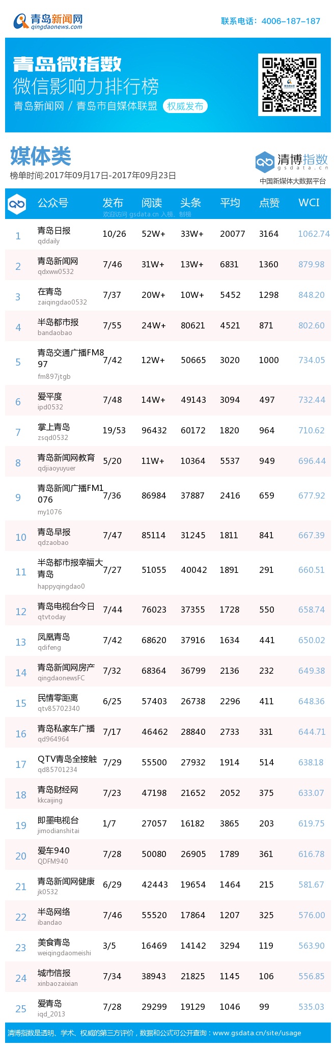 由青島新聞網(wǎng)聯(lián)合清博指數(shù)平臺聯(lián)手打造的“青島微指數(shù)微信影響力排行榜”,通過對各行業(yè)微信公眾號的日常監(jiān)測,對所有賬號在統(tǒng)計周期內(nèi)所發(fā)布內(nèi)容的發(fā)文總數(shù)、總閱讀數(shù)、頭條閱讀數(shù)、平均閱讀數(shù)及總點贊數(shù)等海量數(shù)據(jù)進行分析,幫助各行業(yè)新媒體小編更好地運營微信。