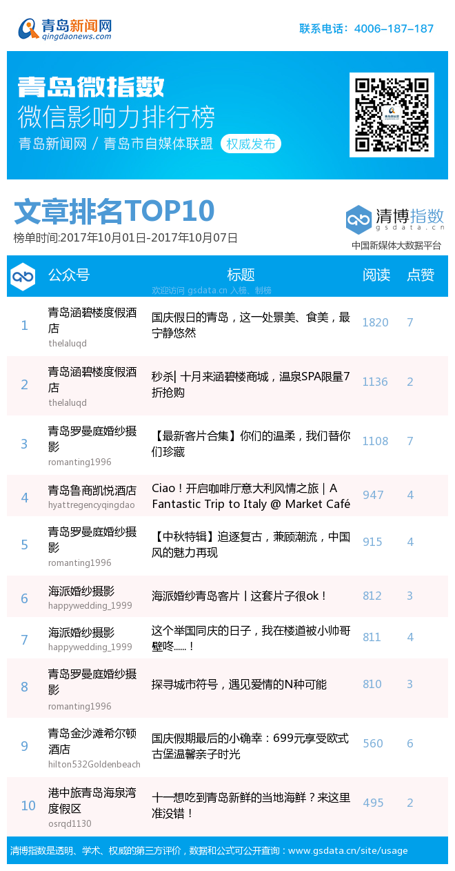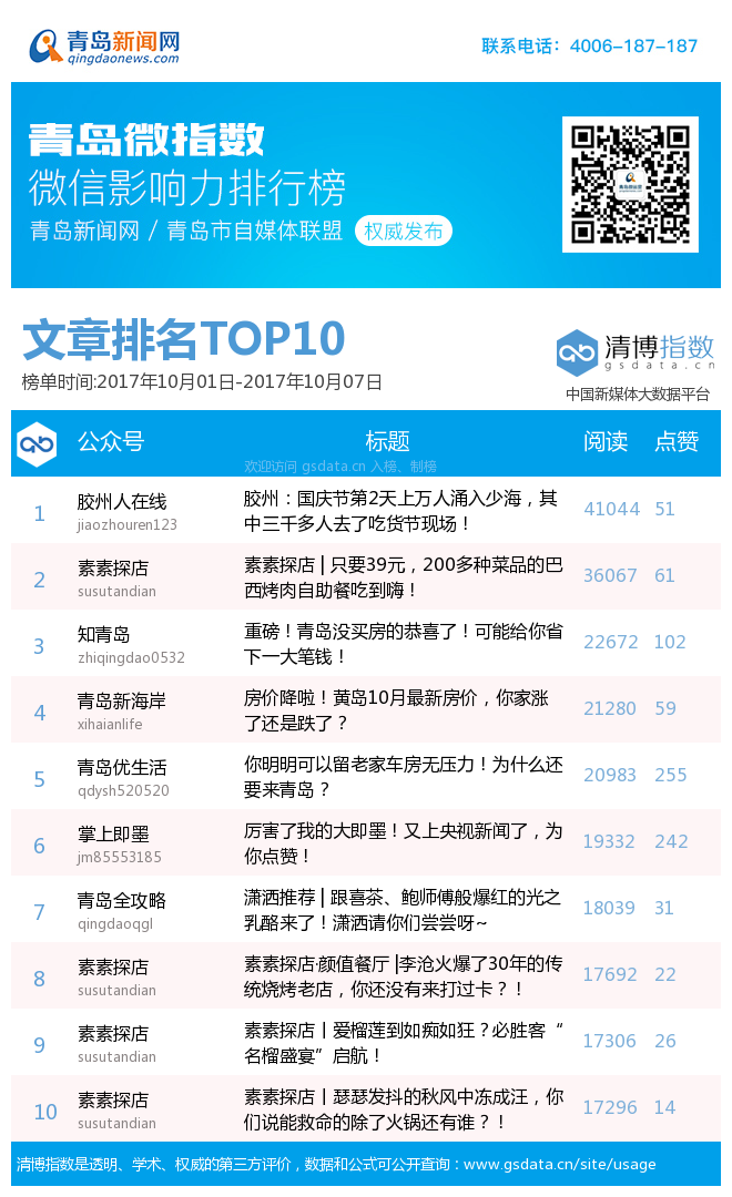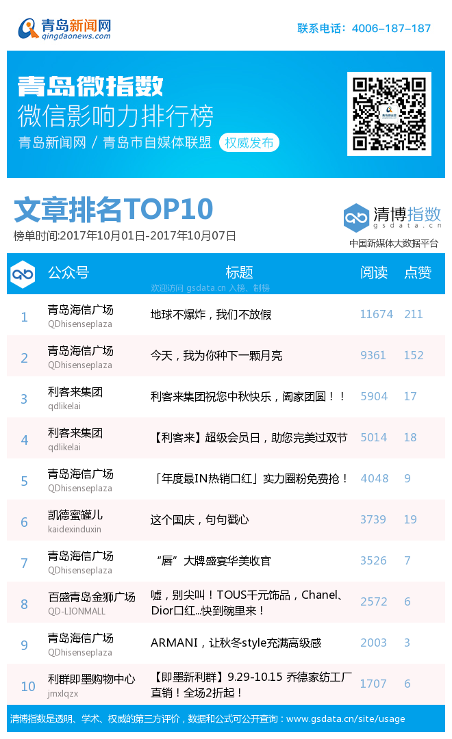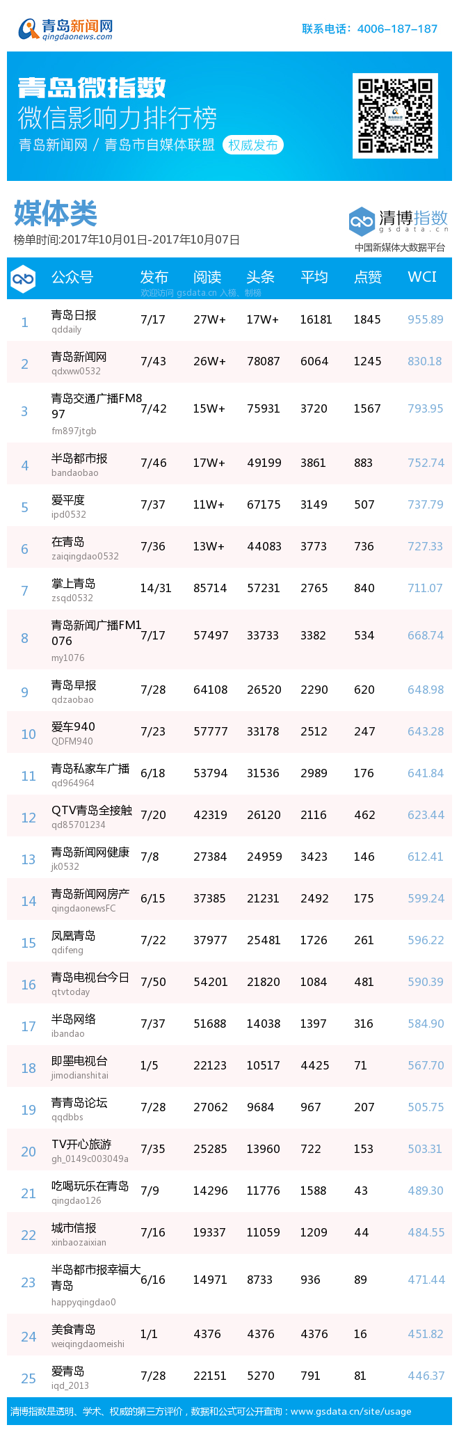 1、“青島微指數(shù)微信影響力排行榜”由青島新聞網(wǎng)微運(yùn)營(yíng)整理發(fā)布。數(shù)據(jù)來自清博指數(shù)。更多信息請(qǐng)關(guān)注。