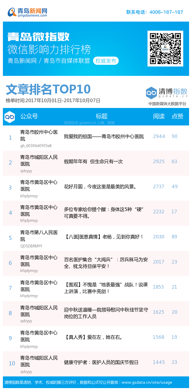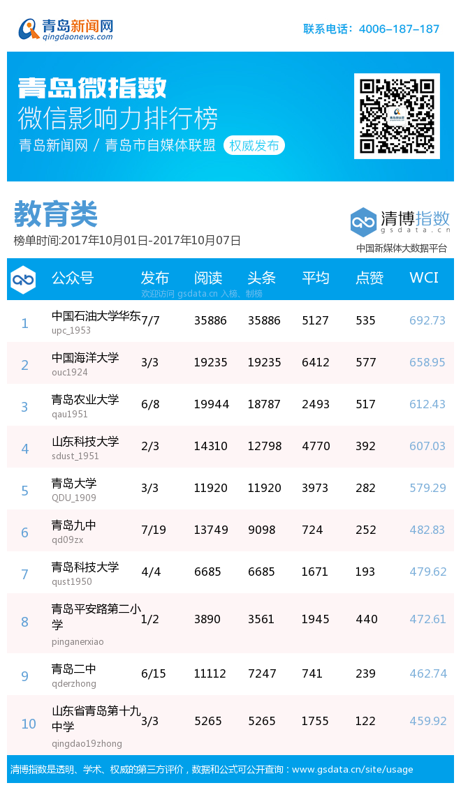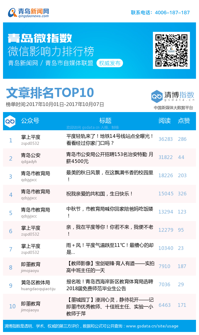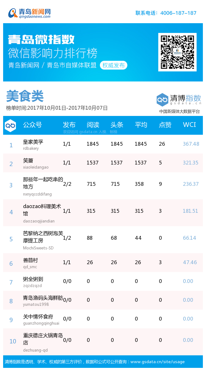 1、“青島微指數(shù)微信影響力排行榜”由青島新聞網(wǎng)微運(yùn)營(yíng)整理發(fā)布。數(shù)據(jù)來自清博指數(shù)。更多信息請(qǐng)關(guān)注。