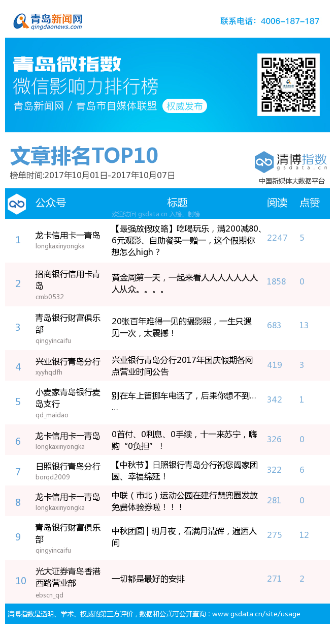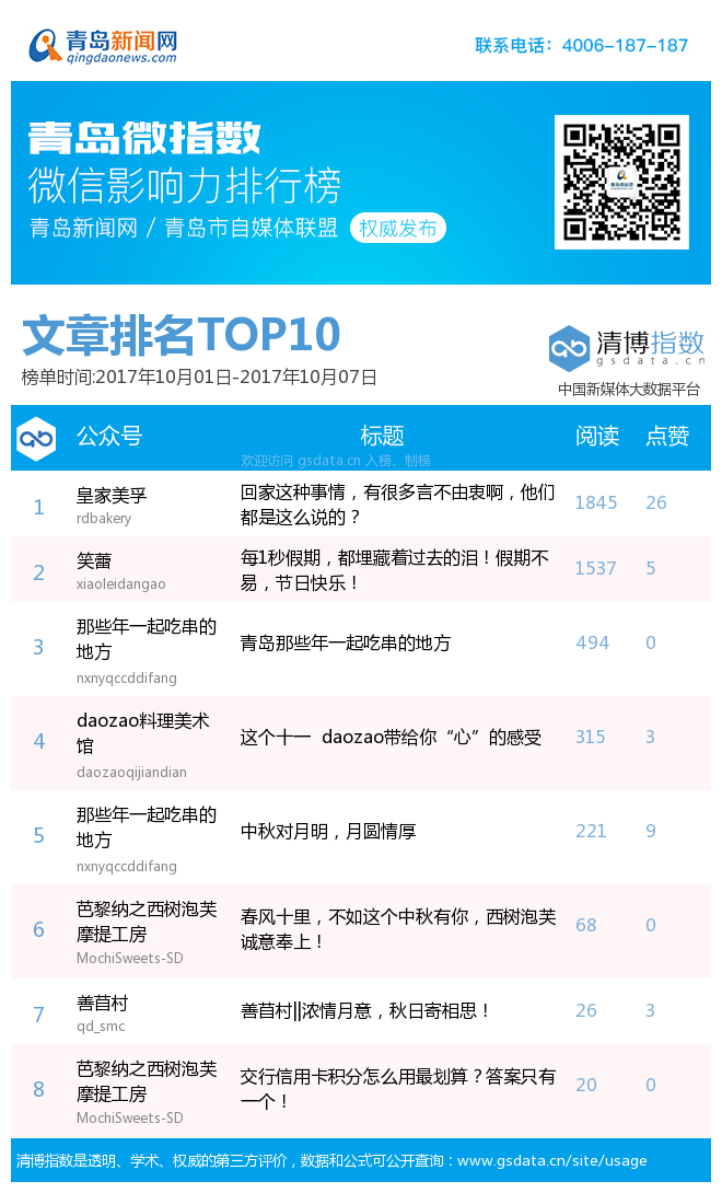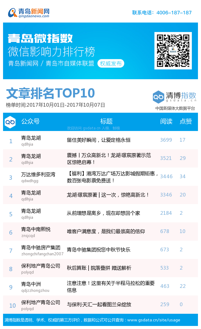 3、本次榜單收錄了青島13個(gè)行業(yè)微信公眾號(hào),如您的賬號(hào)暫未收錄,可聯(lián)系4006-187-187。