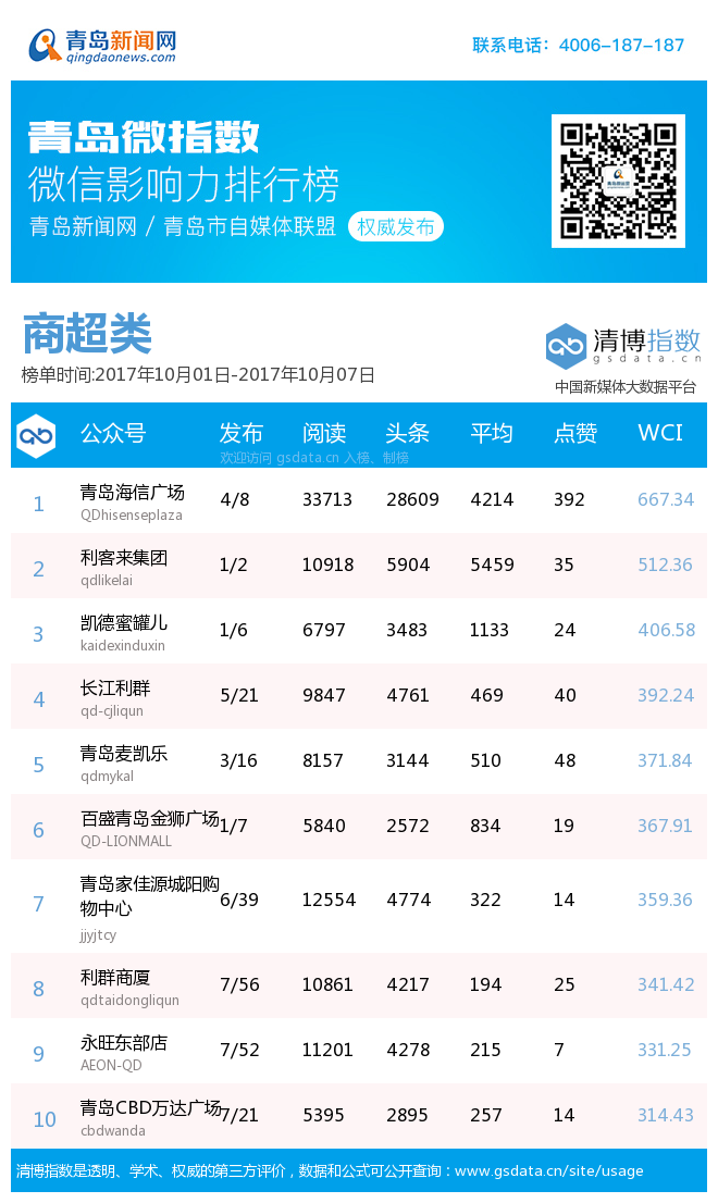由青島新聞網(wǎng)聯(lián)合清博指數(shù)平臺(tái)聯(lián)手打造的“青島微指數(shù)微信影響力排行榜”,通過對(duì)各行業(yè)微信公眾號(hào)的日常監(jiān)測(cè),對(duì)所有賬號(hào)在統(tǒng)計(jì)周期內(nèi)所發(fā)布內(nèi)容的發(fā)文總數(shù)、總閱讀數(shù)、頭條閱讀數(shù)、平均閱讀數(shù)及總點(diǎn)贊數(shù)等海量數(shù)據(jù)進(jìn)行分析,幫助各行業(yè)新媒體小編更好地運(yùn)營(yíng)微信。