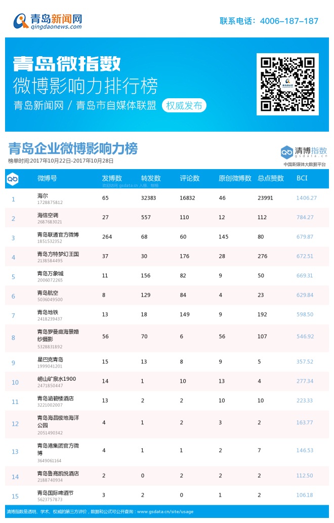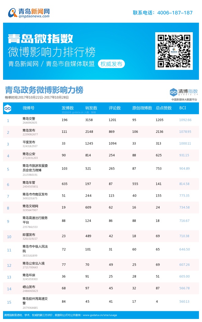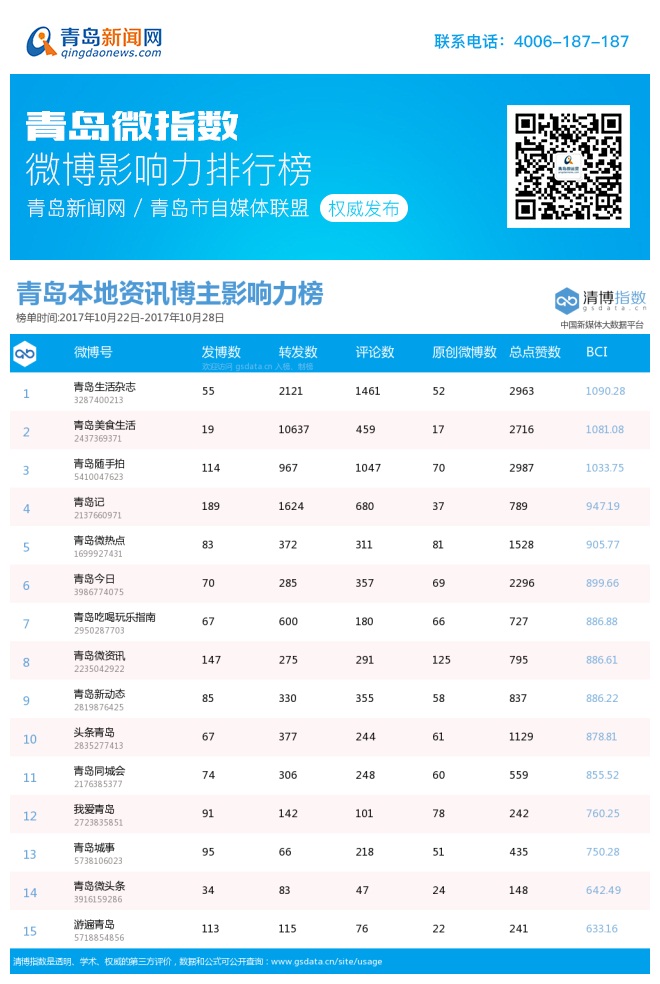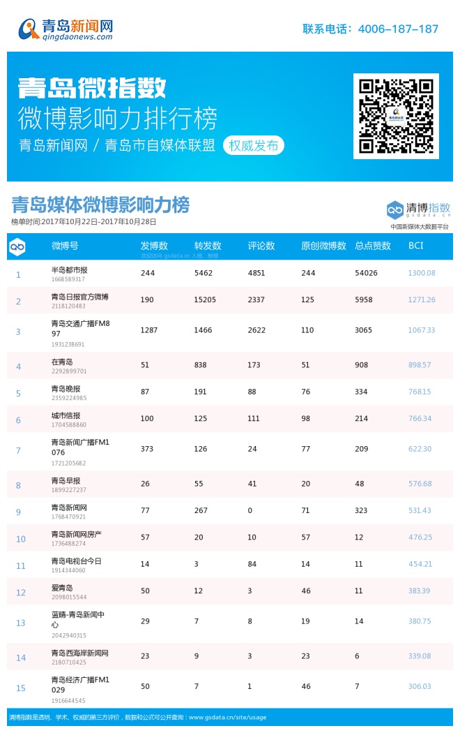由青島新聞網(wǎng)聯(lián)合清博指數(shù)平臺聯(lián)手打造的“青島微指數(shù)微博影響力排行榜”,通過對各行業(yè)微信公眾號的日常監(jiān)測,對所有賬號在統(tǒng)計周期內(nèi)所發(fā)布內(nèi)容的發(fā)文總數(shù)、總閱讀數(shù)、轉(zhuǎn)發(fā)數(shù)、評論數(shù)及總點贊數(shù)等海量數(shù)據(jù)進行分析,幫助各行業(yè)新媒體小編更好地運營微博。