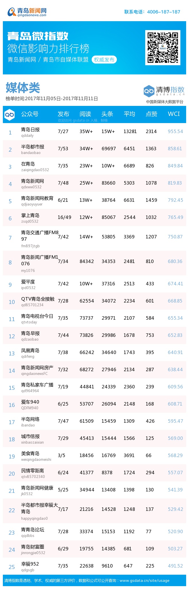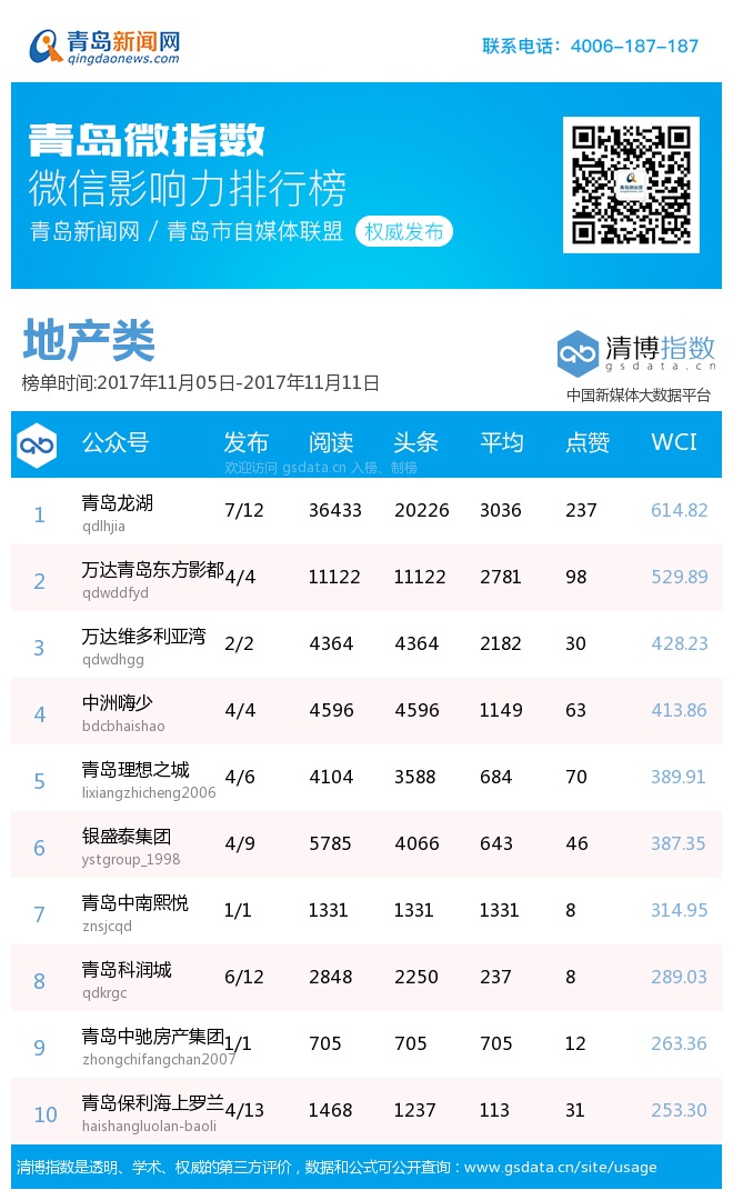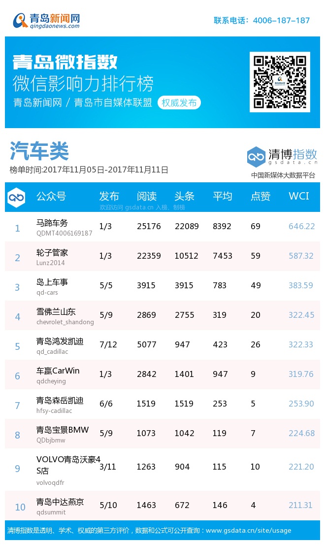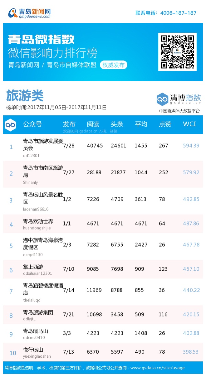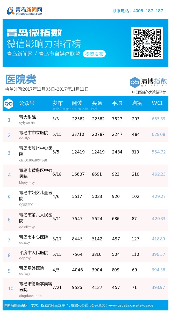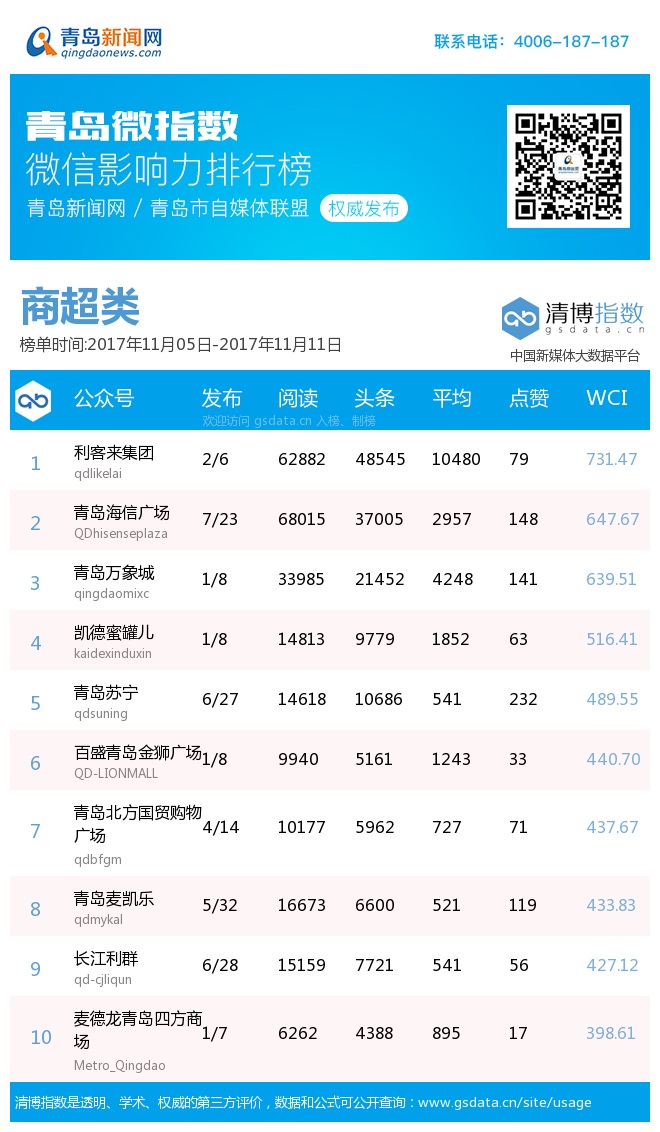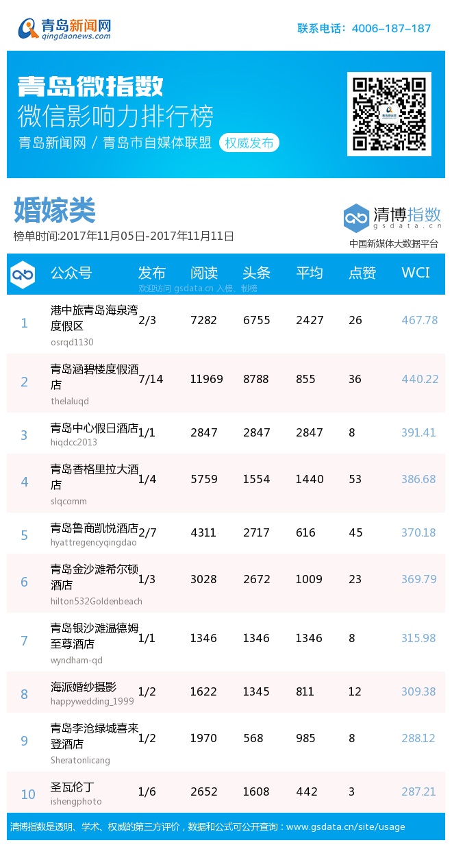 3、本次榜單收錄了青島13個行業(yè)微信公眾號,如您的賬號暫未收錄,可聯(lián)系4006-187-187。