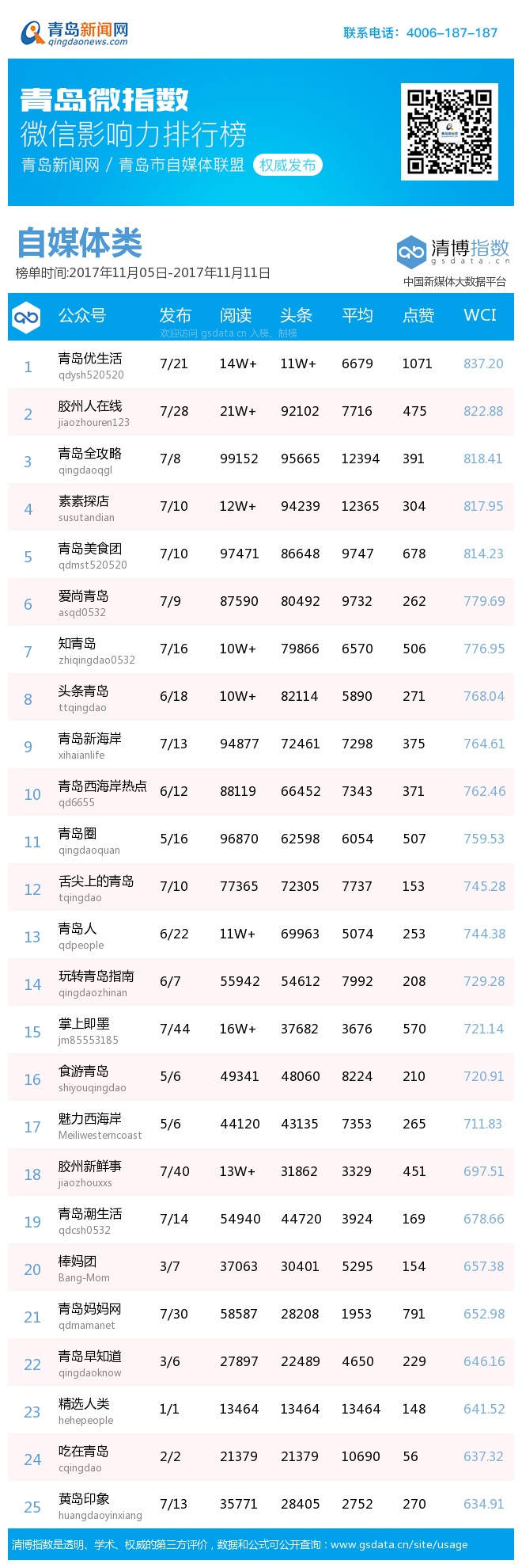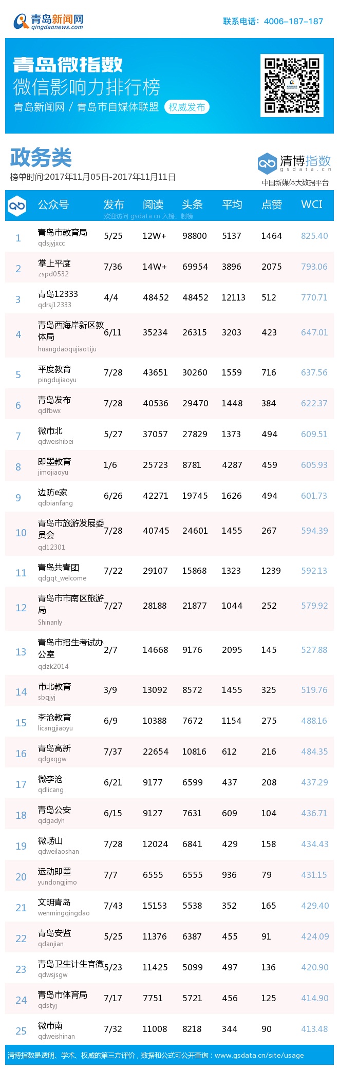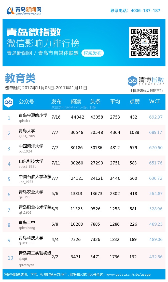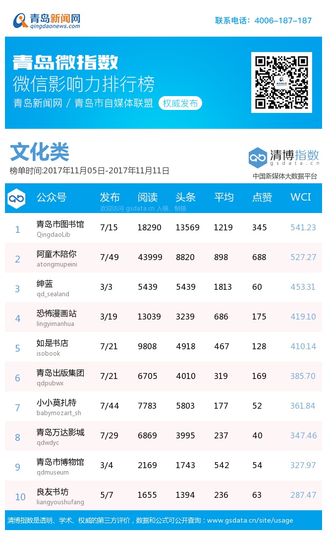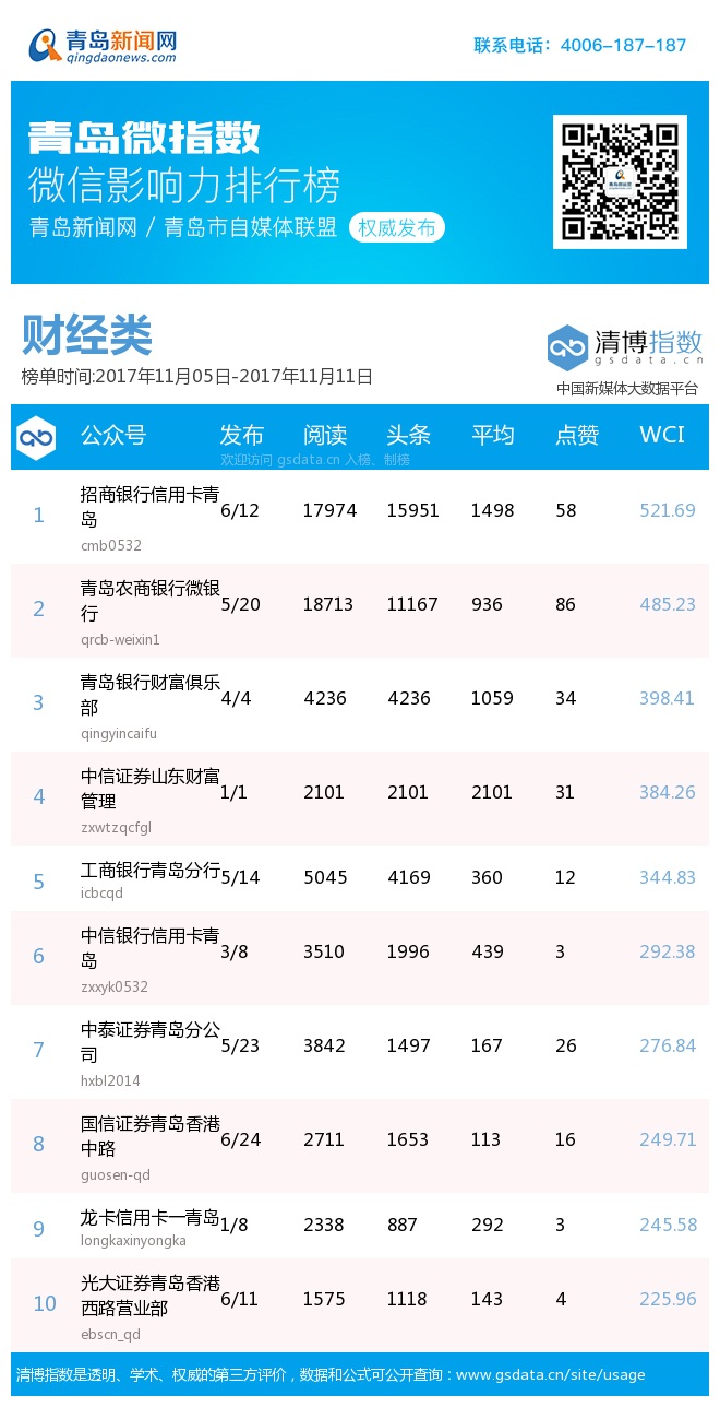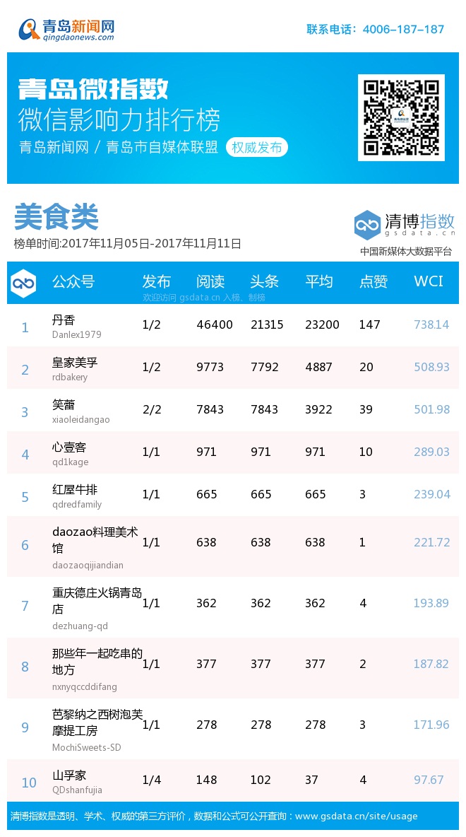 3、本次榜單收錄了青島13個行業(yè)微信公眾號,如您的賬號暫未收錄,可聯(lián)系4006-187-187。