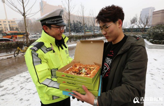 青島必勝客餐廳為市南區(qū)交警大隊(duì)香港西路中隊(duì)的執(zhí)勤交警們送去暖心的午餐和熱飲,將一份份溫暖和關(guān)懷送給佇立在風(fēng)雪中的交警。與此同時,濟(jì)南必勝客餐廳向熬夜清理積雪的環(huán)衛(wèi)工人送去了暖暖的溫情,并表示無限的敬意。