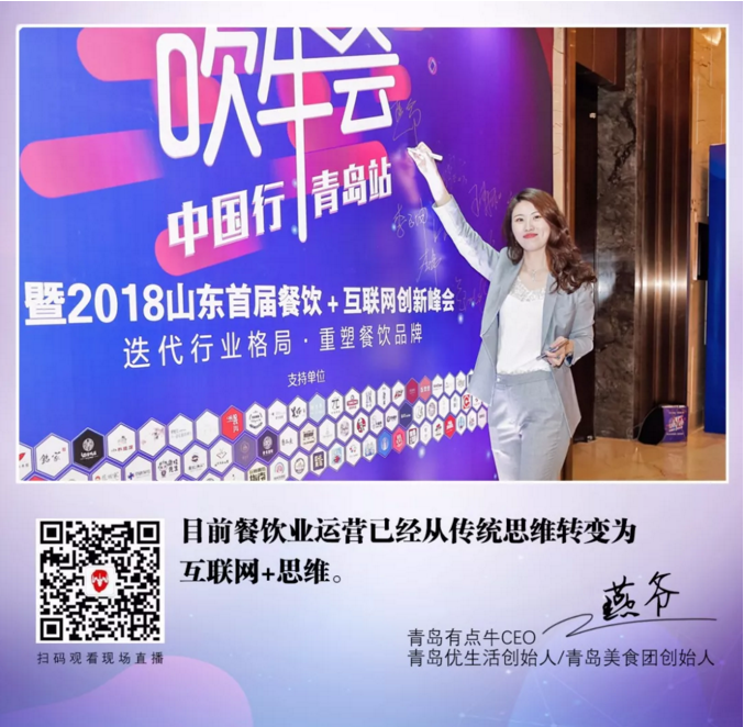 峰會(huì)一開始,青島有點(diǎn)牛CEO、青島優(yōu)生活創(chuàng)始人、青島美食團(tuán)創(chuàng)始人燕爺首先致歡迎辭。她提出,目前餐飲業(yè)運(yùn)營,已經(jīng)從傳統(tǒng)思維,轉(zhuǎn)變?yōu)榛ヂ?lián)網(wǎng)+思維。用戶對(duì)餐飲的需求,不僅要好吃,還要好看;對(duì)環(huán)境的需求,不僅要干凈,還要有逼格!每一個(gè)餐飲企業(yè)都應(yīng)該依托互聯(lián)網(wǎng)營銷,建立自己的大數(shù)據(jù)系統(tǒng),充分發(fā)揮粉絲經(jīng)濟(jì)和分享經(jīng)濟(jì)的優(yōu)勢(shì)!