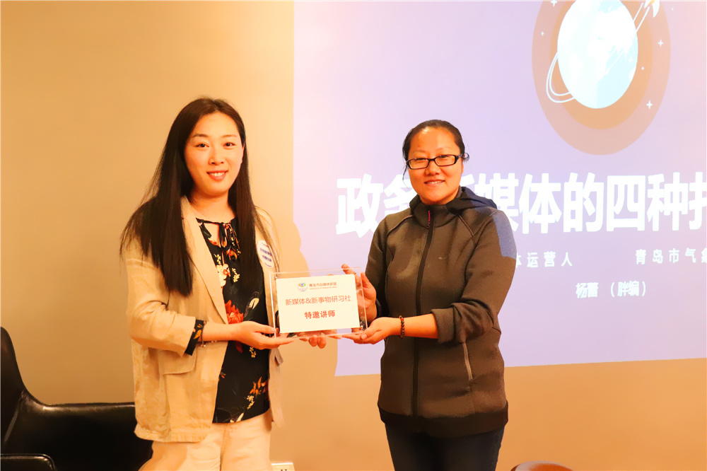青島市自媒體聯(lián)盟為楊蕾頒發(fā)講師牌