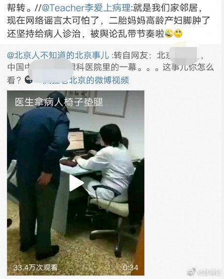 近日網(wǎng)傳一則視頻稱,在北京某眼科醫(yī)院,一位女醫(yī)生在值班坐診時(shí),將本該是患者坐的凳子放在自己腳下,卻讓一旁的年邁患者站著看病。視頻稱,這是醫(yī)德有問(wèn)題。對(duì)此,微博介紹為北京知名三甲醫(yī)院醫(yī)生的博友@Teacher李愛上病理辟謠指出,視頻中的女醫(yī)生正是他的鄰居,這位女醫(yī)生其實(shí)是一名懷了二胎的高齡產(chǎn)婦,因?yàn)槟_腫的厲害,但又堅(jiān)持為病人問(wèn)診,所以才出現(xiàn)了視頻中的一幕。