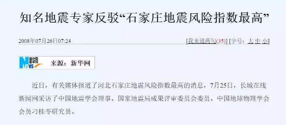 其實,這是一份2004年就公布的報告,曾在數(shù)次地震之后引起各方強烈“圍觀”,在2008年和2013年,就已經(jīng)有專家專門進行過辟謠。而《30個省級城市地震風(fēng)險出爐石家莊最高上海最低》這份報告是一個研究生的論文,專家已經(jīng)駁斥其論點,作者本人也已經(jīng)承認觀點錯誤并道歉。