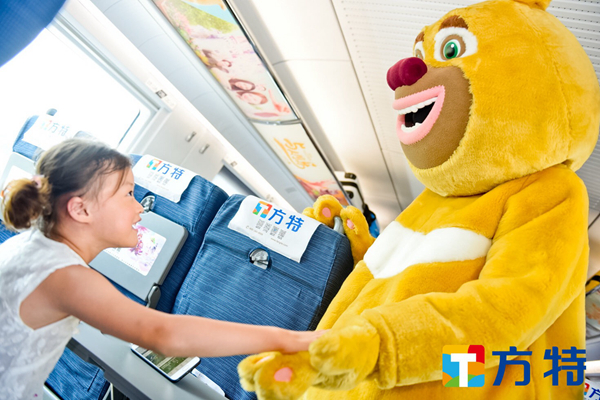 在發(fā)車儀式現(xiàn)場,極具異域文化特色的非洲舞蹈表演和方特動漫明星“熊出沒”人偶吸引了眾多旅客的視線。車廂內(nèi)部,隨處可見方特元素——座椅枕巾、創(chuàng)意海報、車窗透明貼、行李架彩貼乃至列車廣播等細節(jié)。出發(fā)后,方特原創(chuàng)動漫IP“熊出沒”人偶還驚喜現(xiàn)身車廂,不時向旅客派發(fā)小禮物,展現(xiàn)萌趣可愛的造型與動作,吸引眾多旅客拍照合影和積極互動。