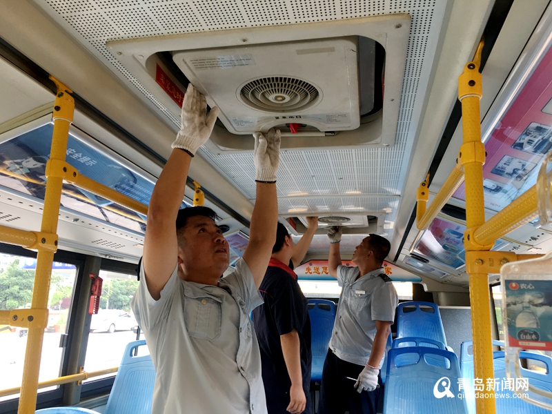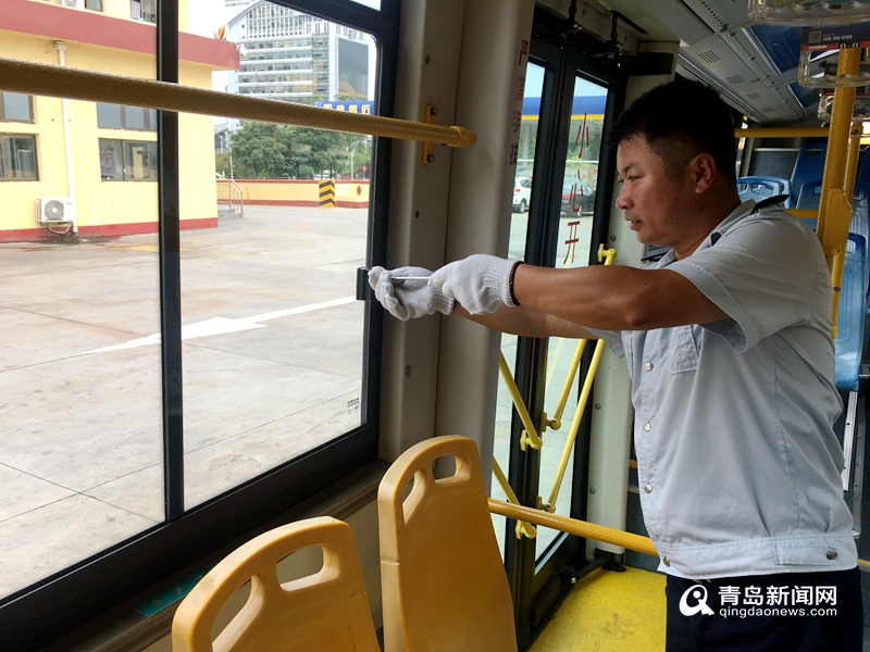 嶗山巴士三分公司技術(shù)員檢查車(chē)輛門(mén)窗