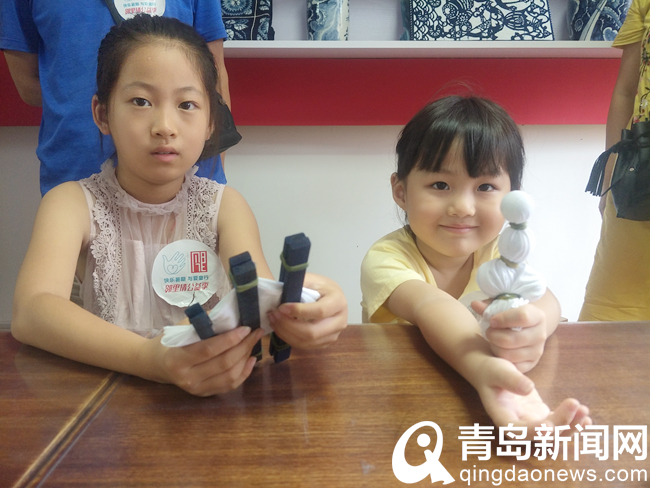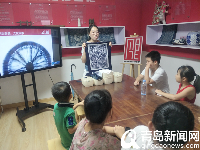 扎染是中國民間傳統(tǒng)而獨特的染色工藝,2006年被列入國家級非物質(zhì)文化遺產(chǎn)。“愛與樂”民藝博物館市南館長梁發(fā)芹現(xiàn)場為孩子們講解了扎染、蠟染、藍夾擷等印染技術(shù)的起源與發(fā)展,結(jié)合博物館陳列的收藏展品,講述每一幅圖案背后的寓意,每一種布料蘊含的時代背景和人文氣息。同時,圍繞扎染的制作工藝,示范講解了布料折疊、圖樣設(shè)計、捆扎等各個步驟。文化有著濃濃的厚重感,梁館長深入淺出、生動有趣的講解卻極大吸引了在場的孩子們。