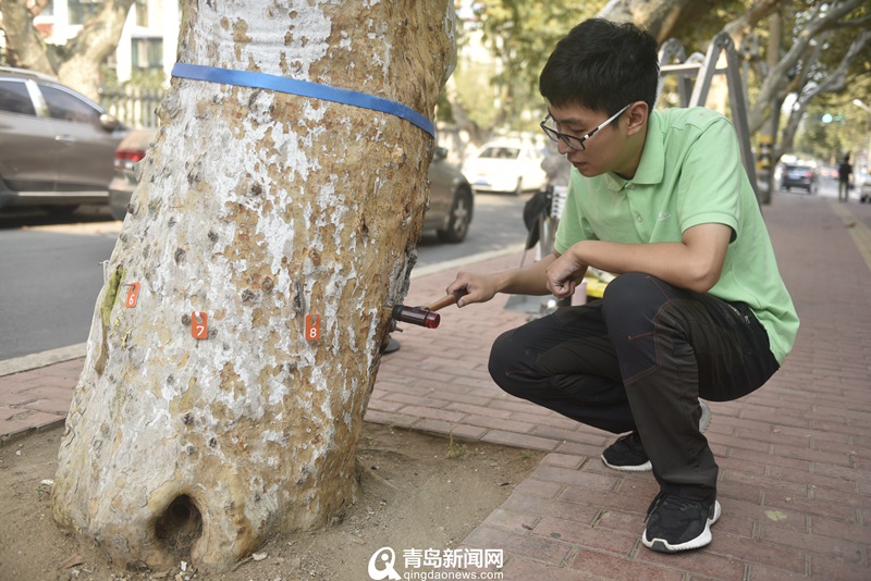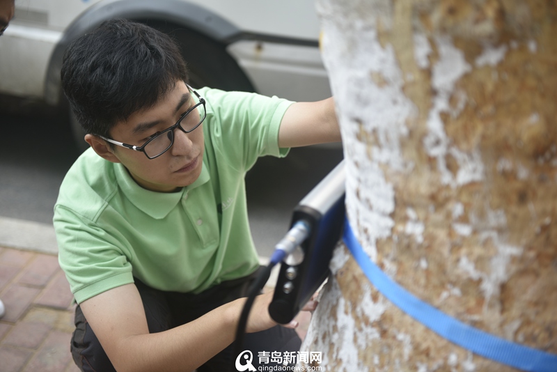 9月30日上午,市北區(qū)城市管理局四方園林服務(wù)中心在南豐路進(jìn)行古樹維護(hù)作業(yè),現(xiàn)場工作人員告訴記者,這臺機(jī)器的價格將近20萬元,在以往的古樹修復(fù)工作中,由于缺乏專業(yè)的工具,很多古樹修復(fù)單位主要依靠錘子敲擊樹干來判斷樹干內(nèi)部生長狀況,此種方法既不專業(yè)也不能準(zhǔn)確掌握古樹樹干的生長狀況,容易對樹木生長狀況產(chǎn)生誤判。為解決此問題,中心引進(jìn)了這臺高科技設(shè)備。