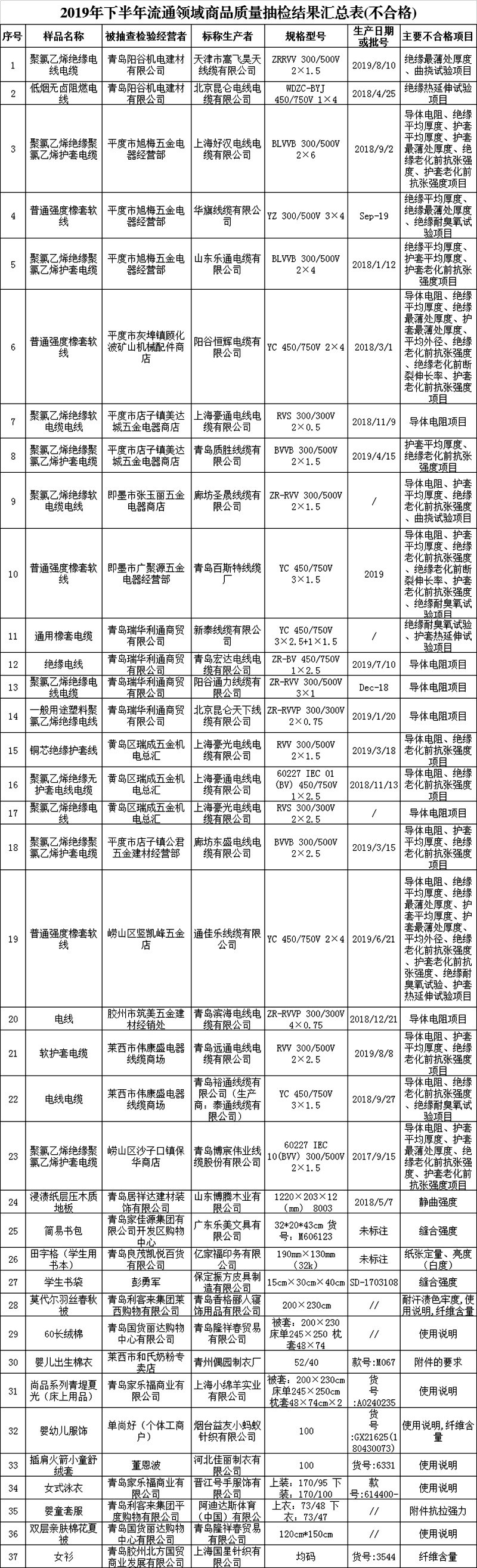 青島新聞網(wǎng)12月25日訊(記者 黃曉)青島市市場(chǎng)監(jiān)督管理局公示了2019年下半年流通領(lǐng)域商品質(zhì)量監(jiān)督抽查結(jié)果,本次共抽檢了153家經(jīng)營(yíng)者的30類285批次商品,其中212批次合格,有65批次不合格,在網(wǎng)絡(luò)抽檢中有8批次商品涉嫌存在違法問(wèn)題。不合格商品涉及服裝、皮鞋、文具、兒童玩具、兒童家具、衛(wèi)生紙、毛巾、床上用品、電線電纜等多個(gè)品類。