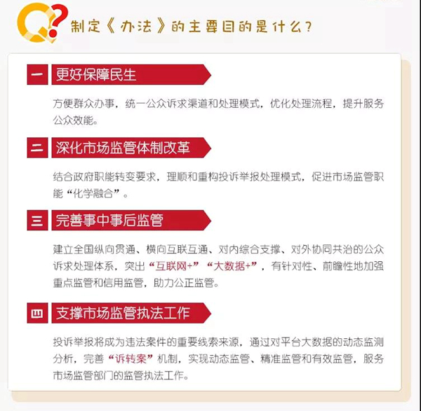 2018年3月,國務(wù)院新一輪機(jī)構(gòu)改革組建了國家市場監(jiān)督管理總局,整合原工商行政管理、質(zhì)量監(jiān)督、食品藥品監(jiān)督管理、價(jià)格監(jiān)督檢查、知識(shí)產(chǎn)權(quán)執(zhí)法、反壟斷執(zhí)法等職責(zé),實(shí)行統(tǒng)一市場監(jiān)管。原相關(guān)部門分別開設(shè)了12315、12365、12331、12358、12330等投訴舉報(bào)熱線,并制定了不同的處理制度。根據(jù)中央《關(guān)于深化市場監(jiān)管綜合行政執(zhí)法改革的指導(dǎo)意見》關(guān)于整合統(tǒng)一的12315投訴舉報(bào)熱線的要求及總局“三定”方案,為推進(jìn)市場監(jiān)管體制改革和政府職能轉(zhuǎn)變,統(tǒng)一投訴舉報(bào)處理制度,提升監(jiān)管執(zhí)法和消費(fèi)維權(quán)效能,更好保障社會(huì)公眾利益,總局在吸收原相關(guān)部門投訴舉報(bào)處理制度的基礎(chǔ)上,組織起草了該《辦法》。