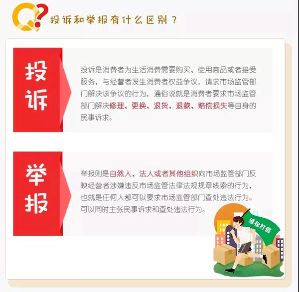 《辦法》第三條明確了投訴和舉報(bào)的區(qū)別。投訴是消費(fèi)者為生活消費(fèi)需要購買、使用商品或者接受服務(wù),與經(jīng)者發(fā)生消費(fèi)者權(quán)益爭議,請(qǐng)求市場監(jiān)管部門解決該爭議的行為,通俗說就是消費(fèi)者要求市場監(jiān)管部門解決修理、更換、退貨、退款、賠償損失等自身的民事訴求。舉報(bào)則是自然人、法人或者其他組織向市場監(jiān)管部門反映經(jīng)營者涉嫌違反市場監(jiān)管法律法規(guī)規(guī)章線索的行為,也就是任何人都可以要求市場監(jiān)管部門查處違法行為。可以同時(shí)主張民事訴求和查處違法行為。