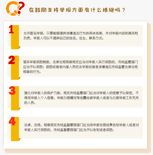 此外,《辦法》第三十二條指出,法律、法規(guī)、規(guī)章規(guī)定市場監(jiān)督管理部門應(yīng)當(dāng)將舉報(bào)處理結(jié)果告知舉報(bào)人或者對(duì)舉報(bào)人實(shí)行獎(jiǎng)勵(lì)的,市場監(jiān)督管理部門應(yīng)當(dāng)予以告知或者獎(jiǎng)勵(lì)。
