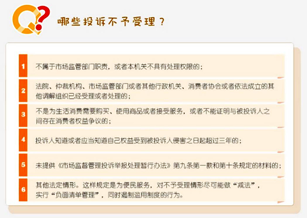 《辦法》第十五條明確表示“投訴有下列情形之一的,市場監(jiān)督管理部門不予受理”,這些情形有:投訴事項(xiàng)不屬于市場監(jiān)督管理部門職責(zé),或者本行政機(jī)關(guān)不具有處理權(quán)限的;法院、仲裁機(jī)構(gòu)、市場監(jiān)督管理部門或者其他行政機(jī)關(guān)、消費(fèi)者協(xié)會(huì)或者依法成立的其他調(diào)解組織已經(jīng)受理或者處理過同一消費(fèi)者權(quán)益爭議的;不是為生活消費(fèi)需要購買、使用商品或者接受服務(wù),或者不能證明與被投訴人之間存在消費(fèi)者權(quán)益爭議的;除法律另有規(guī)定外,投訴人知道或者應(yīng)當(dāng)知道自己的權(quán)益受到被投訴人侵害之日起超過三年的;未提供本辦法第九條第一款和第十條規(guī)定的材料的;法律、法規(guī)、規(guī)章規(guī)定不予受理的其他情形。