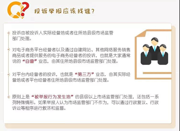此外,對(duì)于日漸增多的電商投訴和舉報(bào),《辦法》第十二條和第二十七條明確規(guī)定了,對(duì)電子商務(wù)平臺(tái)經(jīng)營者以及通過自建網(wǎng)站、其他網(wǎng)絡(luò)服務(wù)銷售商品或者提供服務(wù)的電子商務(wù)經(jīng)營者的投訴、舉報(bào),由其住所地縣級(jí)及以上市場監(jiān)督管理部門處理。對(duì)平臺(tái)內(nèi)經(jīng)營者的投訴、舉報(bào),由其實(shí)際經(jīng)營地或者平臺(tái)經(jīng)營者住所地縣級(jí)及以上市場監(jiān)督管理部門處理。