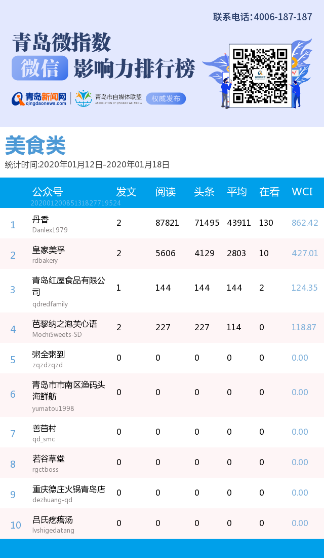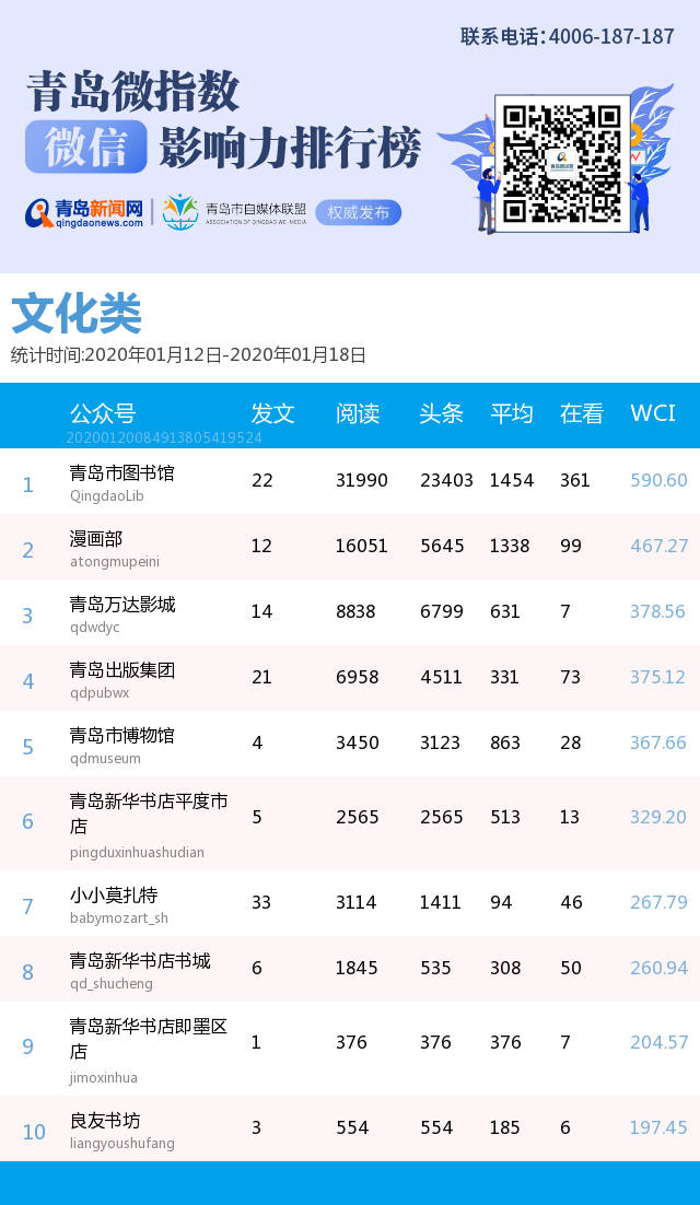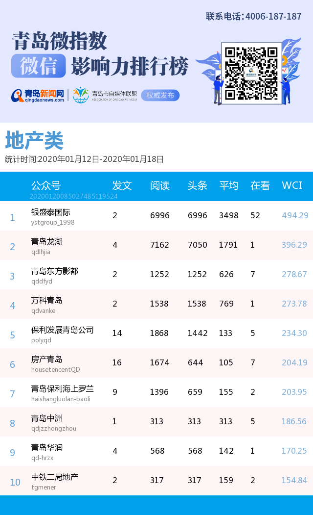 3、本次榜單收錄了青島14個(gè)行業(yè)微信公眾號(hào),如您的賬號(hào)暫未收錄,可聯(lián)系4006-187-187。