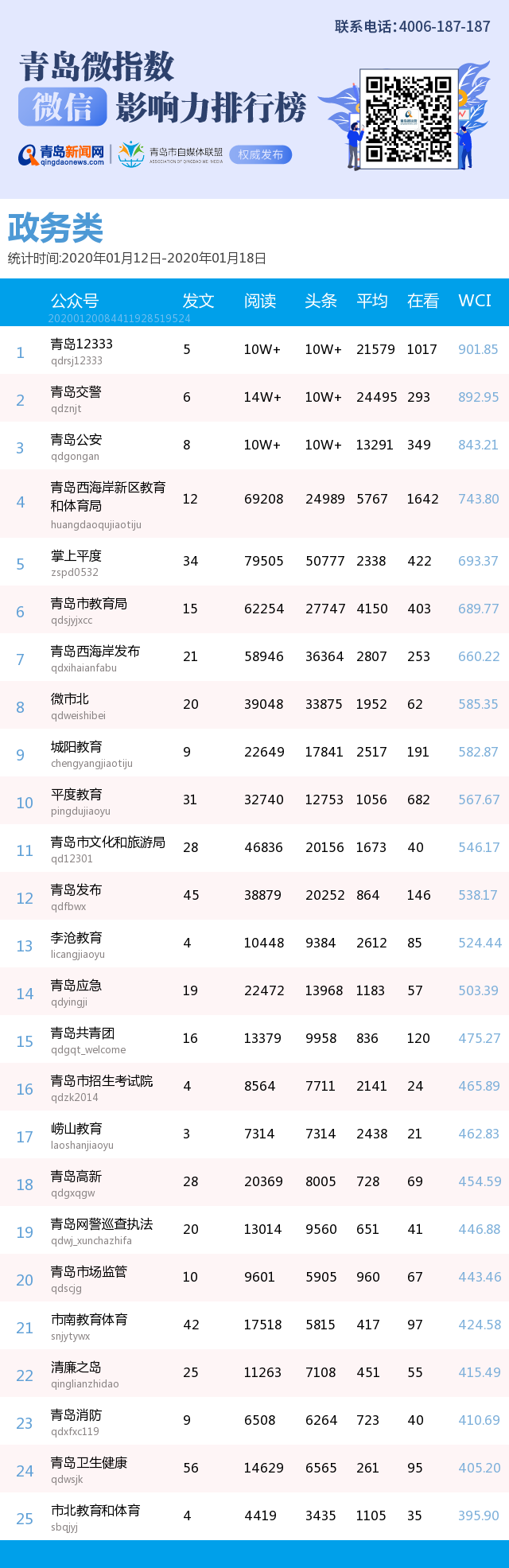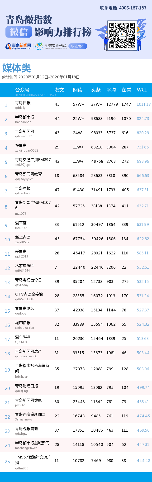 青島新聞網(wǎng)1月20日訊(記者 邢書玲)由青島新聞網(wǎng)打造的“青島微指數(shù)微信影響力排行榜”今日發(fā)布一周(2020年1月12日-2020年1月18日)榜單。