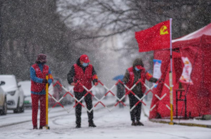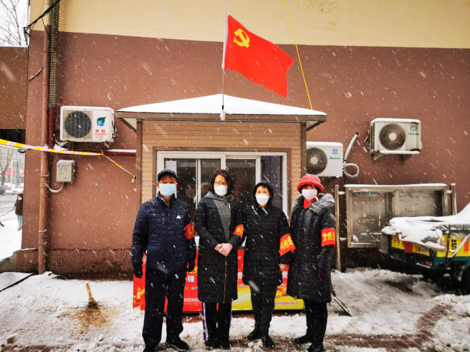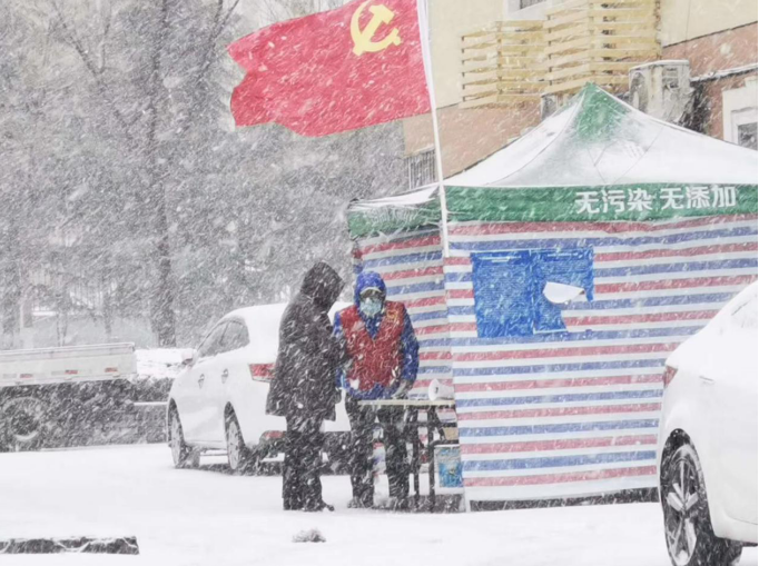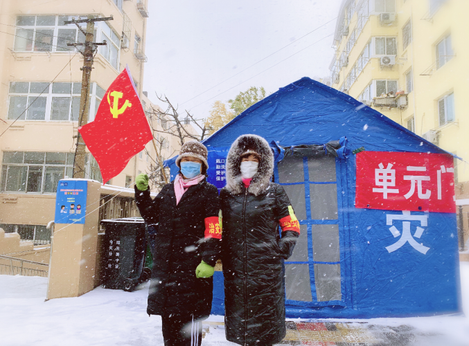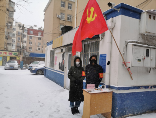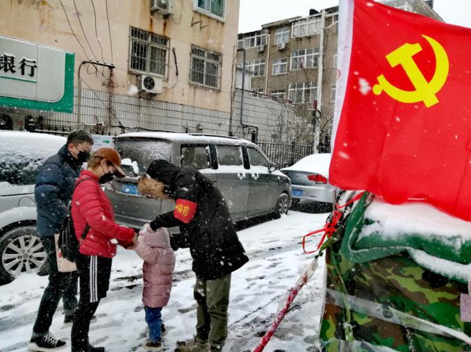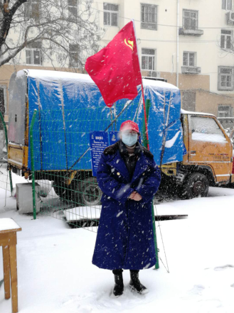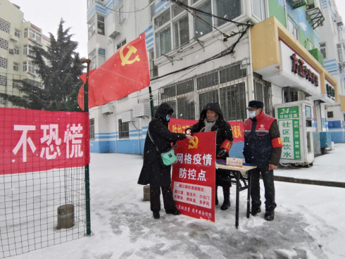 夾有冰雹的雪花在寒風(fēng)的裹挾下爭相飄落,而開平路街道轄區(qū)各個疫情防控點上,數(shù)面鮮紅的黨旗高空飄揚,在皚皚白雪中顯得格外醒目。攜帶紅袖標、黨徽的一線防疫工作人員、志愿者冒著風(fēng)雪一如既往的對出入車輛、外來人員進行核查、登記,他們一邊記錄著信息,一邊和路過的行人打著招呼“慢點,別滑倒”……這個雪天,抗疫一線“堅守者”以自己的身軀,豎起了這個潔白世界里最耀眼、最醒目、最動人的旗幟。