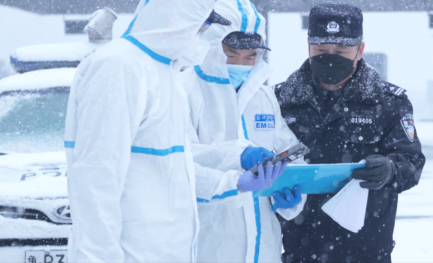 在疫情防控檢測點,工作人員不畏嚴寒,對進入轄區(qū)的車輛和人員一一進行排查登記、測量體溫、消毒和勸返。大雪抵擋不住防控疫情的腳步,雖然最低溫度低至零下,但為了方便書寫,工作人員脫下手套逐一登記過往車輛;雖然冰冷的手寫出的字跡有些潦草,但他們的神情卻是無比的嚴肅認真。