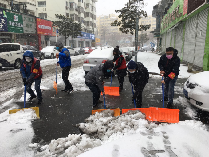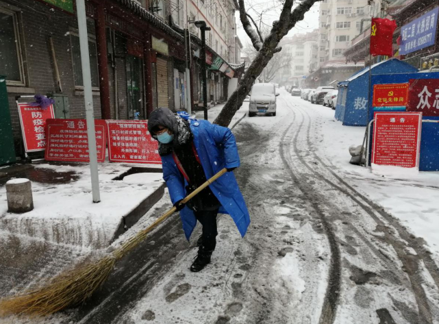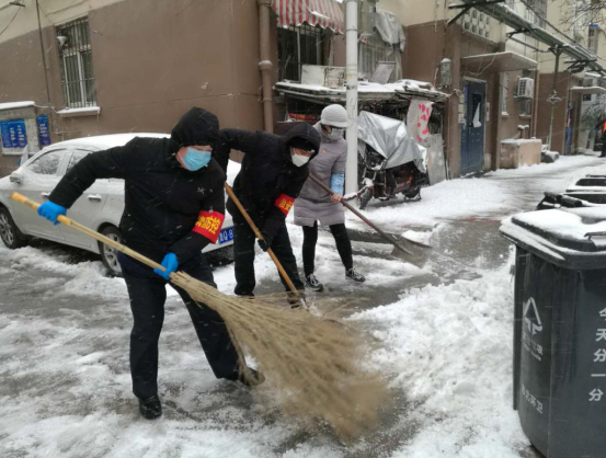 雪情就是命令!防控就是責任!守衛(wèi)好市北區(qū)的“東大門”,為疫情期間居民平安出行鋪就一條“安全路”!合肥路街道的黨員志愿者們沒有向惡劣天氣低頭,守崗執(zhí)勤志愿者們兵分兩路,一路繼續(xù)堅守崗位,做好人員車輛信息登記,為過往人員測量體溫,繼續(xù)守好疫情防護崗;另一路在街道分管領(lǐng)導(dǎo)帶領(lǐng)下,聯(lián)合下沉網(wǎng)格的包聯(lián)干部、黨員、樓組長志愿者、物業(yè)公司等200余人投入到清理積雪的戰(zhàn)斗中。大家手持鐵鍬、掃帚等工具奮戰(zhàn)在小區(qū)樓院、背街小巷一線,掃的掃,鏟的鏟,搓的搓,用鐵鍬等工具把厚的積雪鏟起倒在綠化帶內(nèi),經(jīng)過一上午的連鏟帶掃,奮戰(zhàn)雪情,為居民平安出行消除了隱患。
