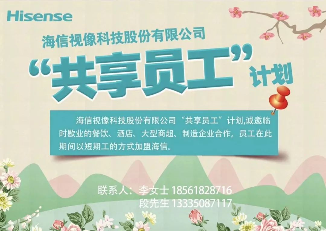 海信視像 : 2 月 11 日正式推出“共享員工”計(jì)劃,與餐飲、酒店、大型商超共同抗“疫”,邀請臨時(shí)歇業(yè)的企業(yè)員工以短期工的方式加盟公司,共同渡過非常時(shí)期。一周來,已經(jīng)共有 60 名“共享員工”到崗。