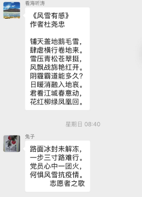 “大雪冰封路難行,腳步踉蹌步履羸。街頭體察民情事,戰(zhàn)斗堡壘雪中凝?!泵鎸谰咔椋_平路街道陽春詩社老師們的生活也不會因此而被按上“暫停鍵”,他們在家為自己、為大家充電,創(chuàng)作一首首令人振奮、令人感動、令人深思的“抗疫詩篇”,傳播衛(wèi)生健康知識、歌頌一線工作人員、教育和引導(dǎo)群眾、鼓舞士氣,增強共克時艱的信心。