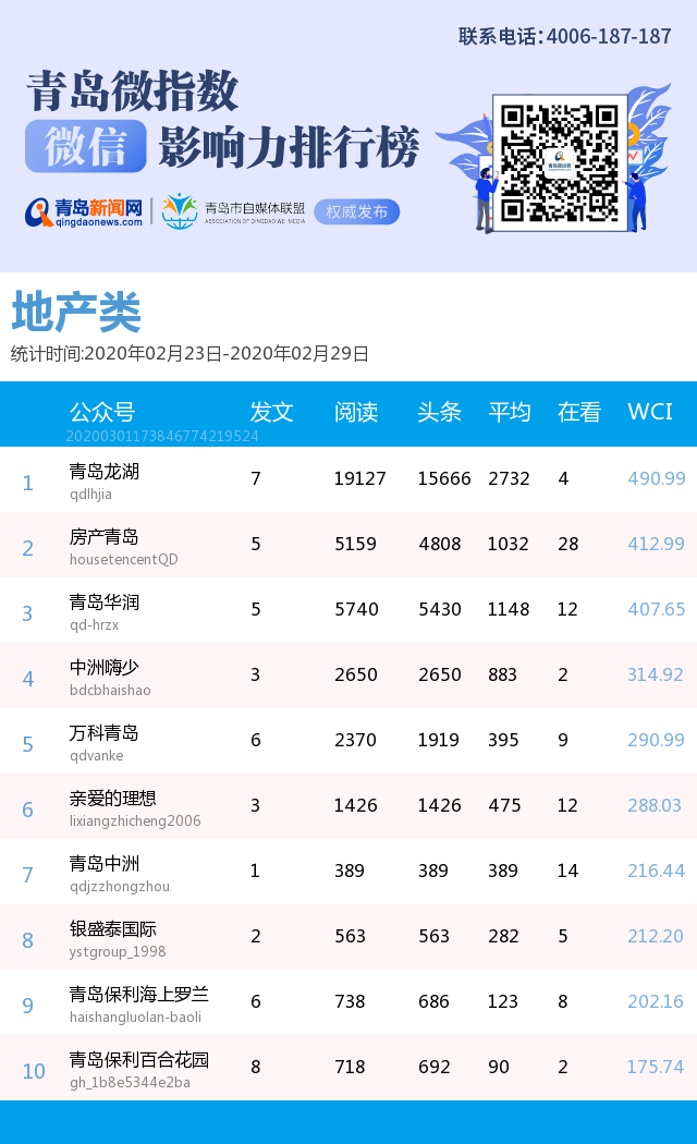 3、本次榜單收錄了青島14個行業(yè)微信公眾號,如您的賬號暫未收錄,可聯(lián)系4006-187-187。