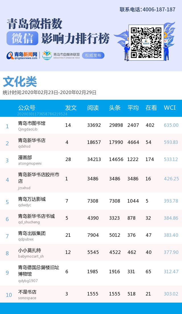 青島新聞網(wǎng)3月2日訊(記者 邢書玲)由青島新聞網(wǎng)打造的“青島微指數(shù)微信影響力排行榜”今日發(fā)布一周(2020年2月23日-2020年2月29日)榜單。
