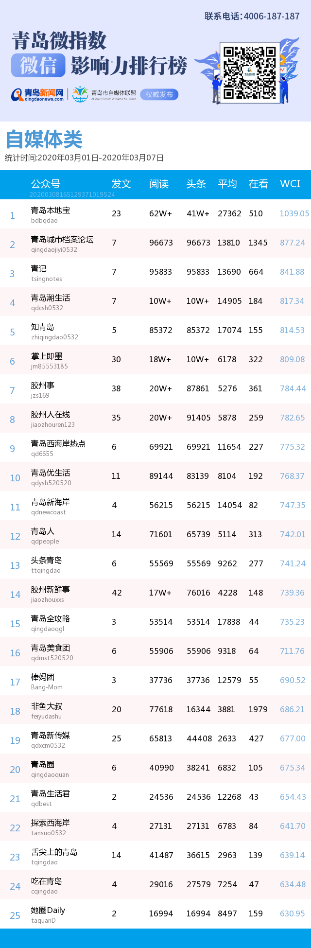 青島新聞網3月9日訊(記者 邢書玲)由青島新聞網打造的“青島微指數(shù)微信影響力排行榜”今日發(fā)布一周(2020年3月1日-2020年3月7日)榜單。