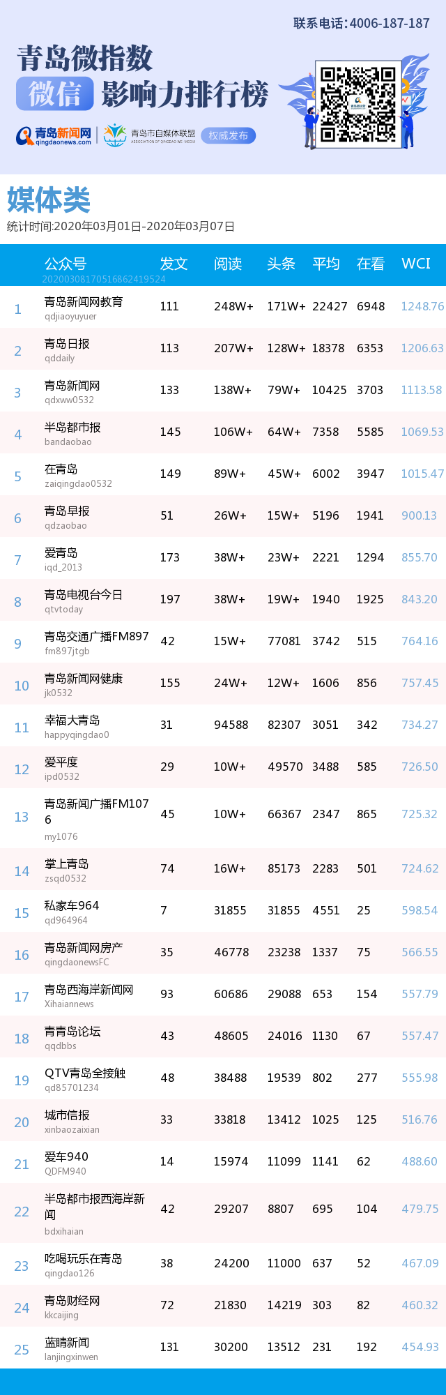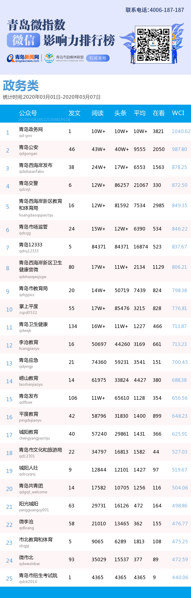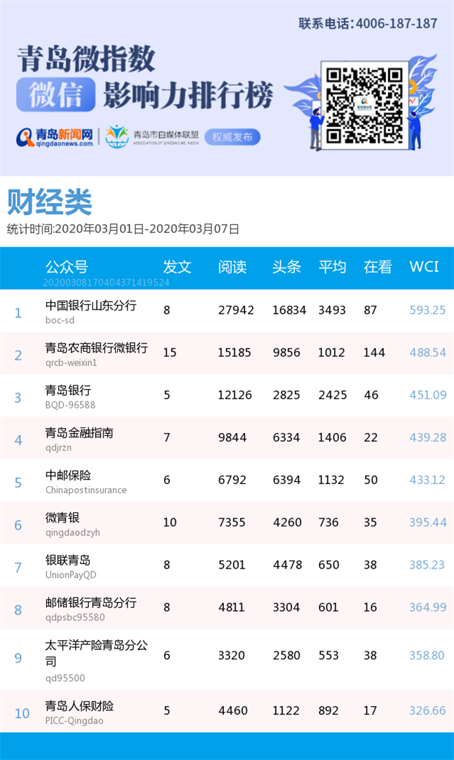 3、本次榜單收錄了青島14個行業(yè)微信公眾號,如您的賬號暫未收錄,可聯(lián)系4006-187-187。
