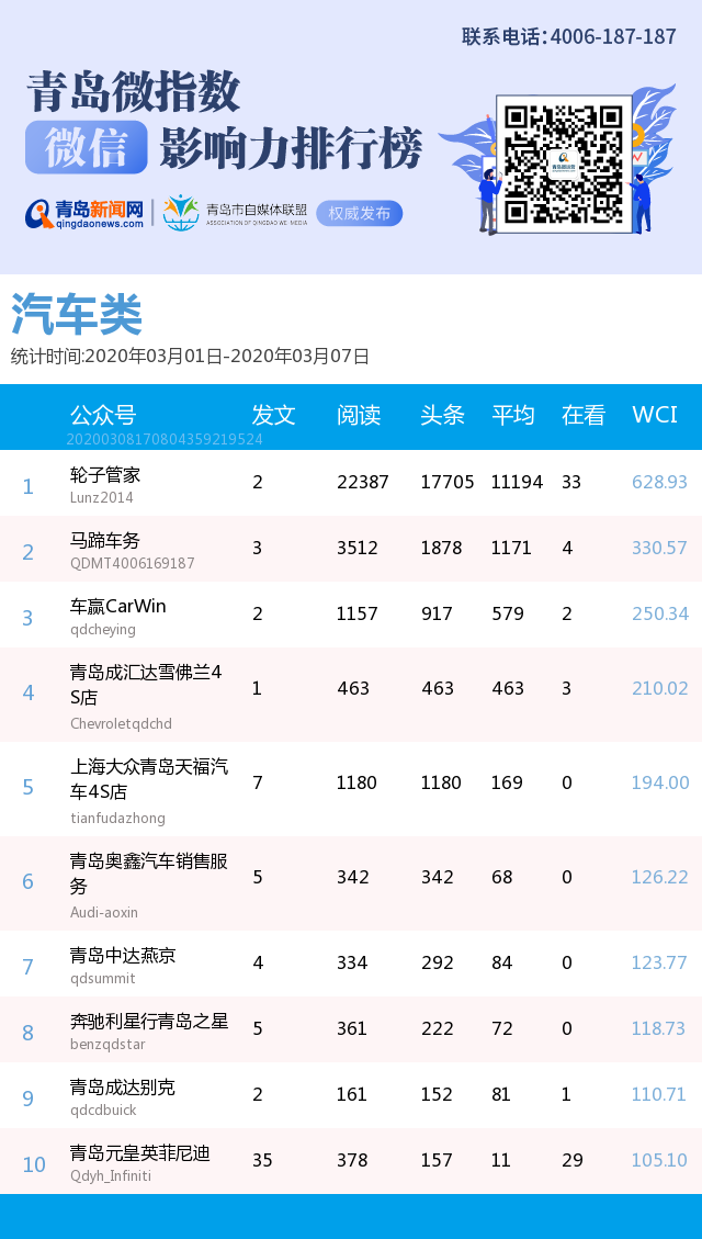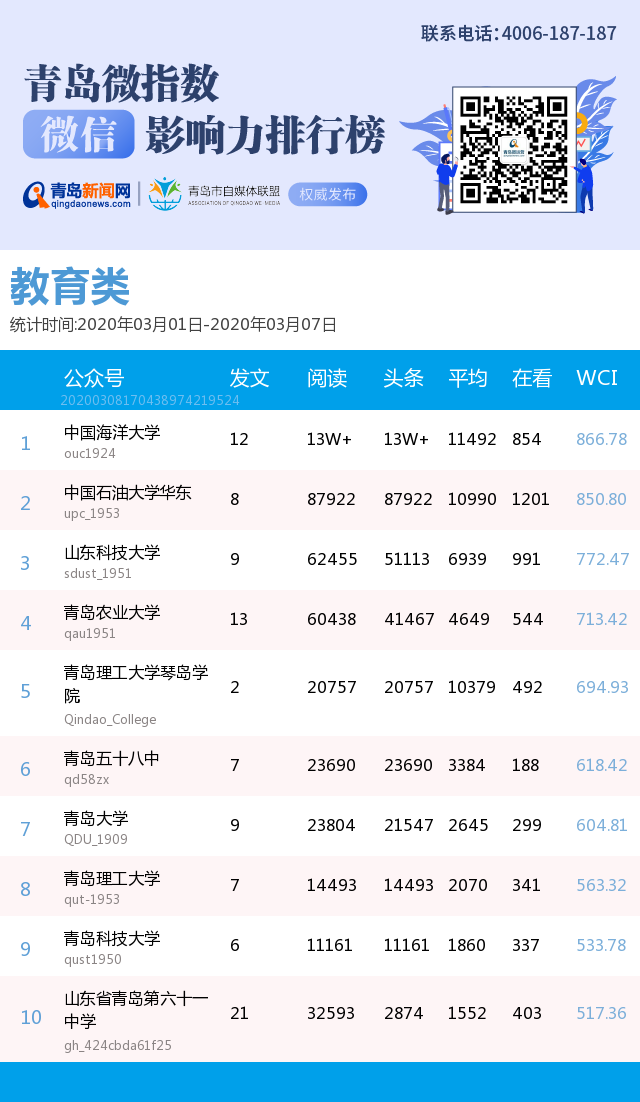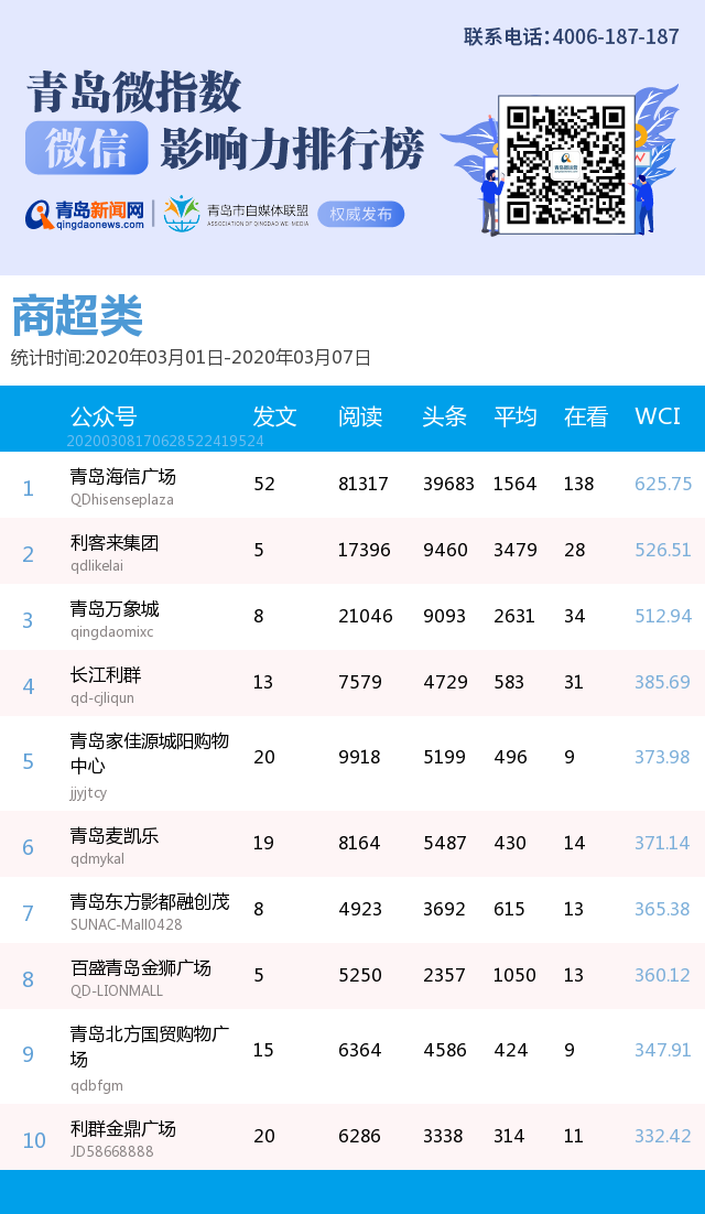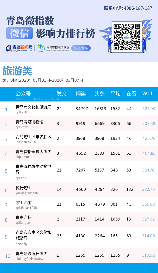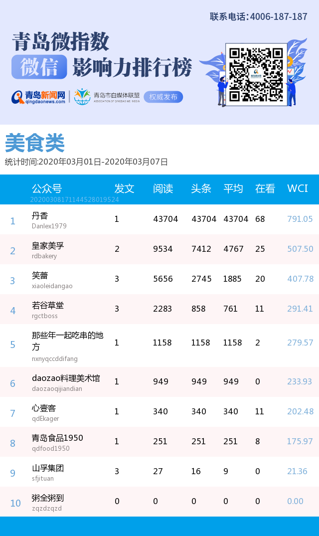 3、本次榜單收錄了青島14個行業(yè)微信公眾號,如您的賬號暫未收錄,可聯(lián)系4006-187-187。
