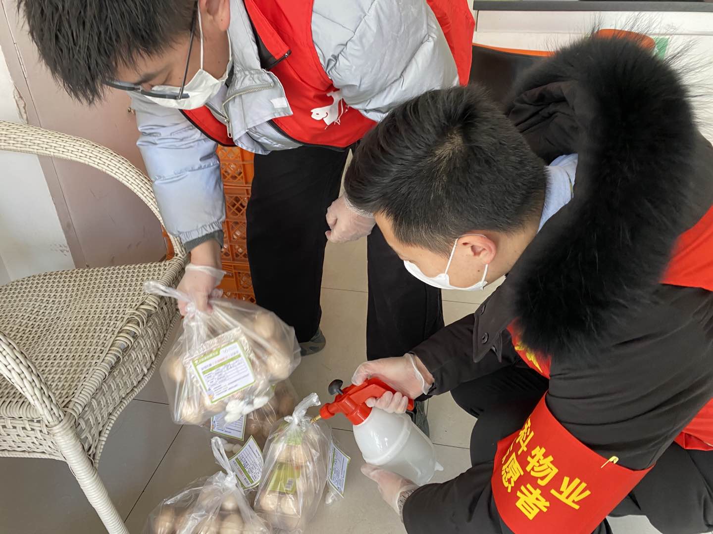 從供應商的貨品分裝、物流運輸,到社區(qū)接收后的倉儲消毒和短駁配送,依托業(yè)主住這兒App全流程密切追蹤,嚴格監(jiān)測操作人員體溫等健康狀況,每一份貨品都有“身份證”。此外,管家還為每位居民準備了酒精棉球包,方便收貨后進行二次消毒。